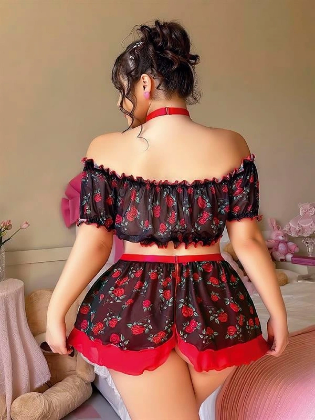 ?? Büyük Beden Siyah Üstüne Gül Desenli Fantezi Etekli Büstiyer Takımı ??