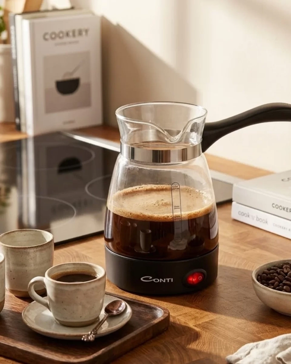 Cam kahve makinesi, geleneksel Türk kahvesi lezzetini pratik ve hızlı bir şekilde hazırlamak isteyen kullanıcılar için tasarlanmış kullanışlı bir mutfak ürünüdür. Elektrikli çalışma sistemi sayesinde ocak kullanmadan kısa sürede kahve hazırlamanıza yardımcı olur. Modern tasarımı ve cam cezve yapısı sayesinde hem şık bir görünüm sunar hem de kahve hazırlama sürecini rahat şekilde takip etmenizi sağlar.650W gücünde çalışan bu elektrikli kahve makinesi, kısa sürede köpüklü ve lezzetli Türk kahvesi hazırlayabilir. Cam cezve tasarımı sayesinde kahve hazırlanırken oluşan köpük ve kaynama süreci rahatlıkla görülebilir. Bu özellik kahvenin taşmasını önlemeye yardımcı olur ve kahve hazırlama sürecini daha kontrollü hale getirir.0.5 litre kapasiteye sahip olan cam kahve makinesi aynı anda yaklaşık 5 fincana kadar Türk kahvesi hazırlama imkanı sunar. Bu özellik özellikle misafir ağırlarken büyük kolaylık sağlar. Tek seferde birden fazla fincan kahve hazırlayarak zamandan tasarruf edebilirsiniz.Ergonomik sap tasarımı sayesinde cezveyi rahat şekilde tutabilir ve kahvenizi kolaylıkla fincanlara dökebilirsiniz. Isıya dayanıklı sap yapısı güvenli kullanım sunar. Ayrıca cam gövde sayesinde kahve hazırlama süreci estetik bir görünüm kazanır.Elektrikli kahve makinesi yalnızca Türk kahvesi hazırlamak için değil, aynı zamanda sütlü içecekleri ısıtmak veya farklı sıcak içecekler hazırlamak için de kullanılabilir. Bu yönüyle mutfakta çok amaçlı bir kullanım sunar.Temizliği oldukça kolay olan cam cezve, kullanımdan sonra rahat şekilde yıkanabilir. Pratik kullanım sunan bu kahve makinesi, kahve severler için günlük kullanımda büyük kolaylık sağlar.