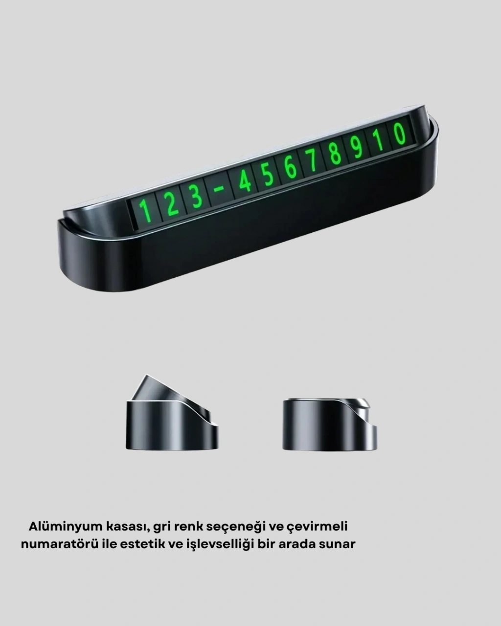 Sade, pratik ve şık bir tasarıma sahip Alüminyum Kasa Gri Araç İçi Park Numaratörü, araç sahiplerine konfor ve kolaylık sağlar. Çevirmeli mekanizması sayesinde telefon numaranızı saniyeler içinde ayarlayabilir, dilediğinizde hızlıca değiştirebilirsiniz.Ürünün yüksek kaliteli alüminyum kasası, dayanıklılık ve uzun ömür sunar. Gri renkli dış yüzeyi, aracınızın iç dizaynına uyum sağlayarak zarif bir görünüm kazandırır.Büyük ve net rakam tasarımı, numaranızın her açıdan rahatça okunmasını sağlar. Bu özellik, özellikle park alanlarında veya sitelerde aracınıza ulaşılmasını kolaylaştırır.Çift taraflı güçlü yapışkan bant, montajı son derece kolay hale getirir. Ön cama veya torpido üzerine sabitlenebilir, hareket sırasında yerinden oynamaz. Paslanmaz yapısı sayesinde sıcak, soğuk veya nemli ortamlarda bile uzun süre sorunsuz kullanılabilir.Modern çizgileri ve kullanışlı formuyla bu park numaratörü, hem şıklık hem de işlevselliği bir arada isteyenler için ideal bir çözümdür.Aracınıza profesyonel bir dokunuş katarken, pratik kullanım avantajıyla da fark yaratır.