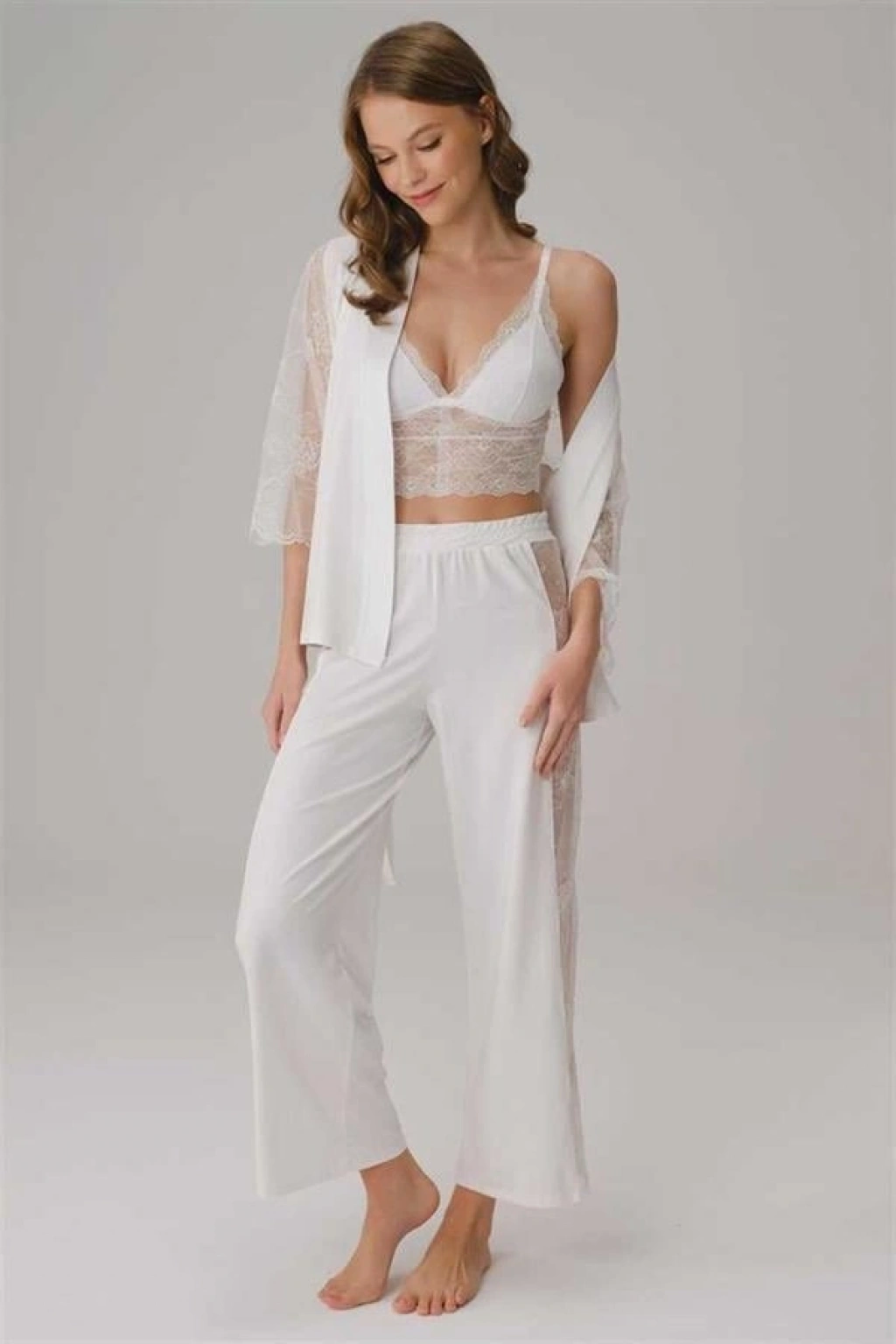 VipMarketim Çeyizlik İp Askılı V Yaka Kadın Düz Yazlık Uzun Dantel Detaylı Pijama Takımı Sabahlık Anıl (Kod:5783)