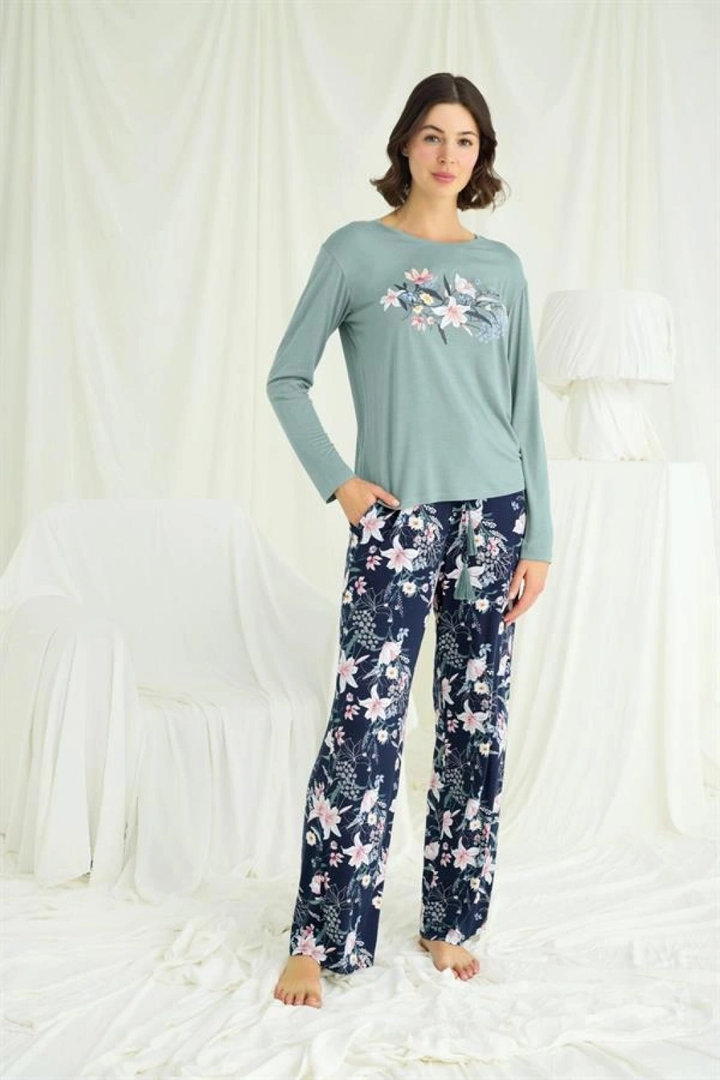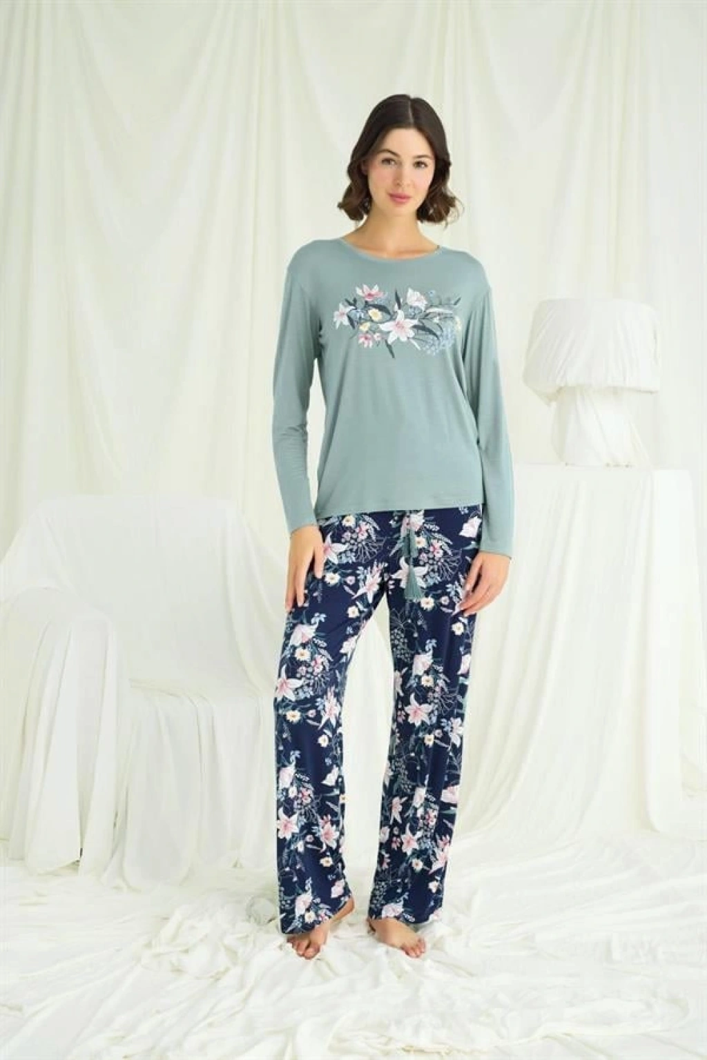 Alt: Lacivert zemin üzerine çiçek ve yaprak desenlidir, önden bağcıklı püskül detaylıdır, ceplidir, örme kumaştır
