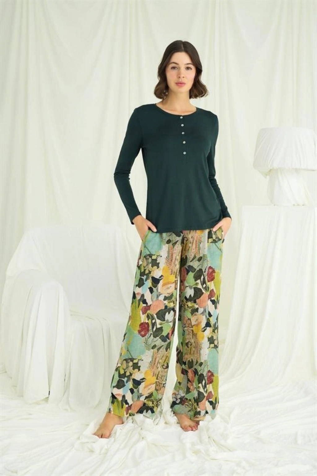 Üst: Yeşil renklidir, bisiklet yakalıdır, uzun kolludur, önü düğmelidir, örme kumaştır.