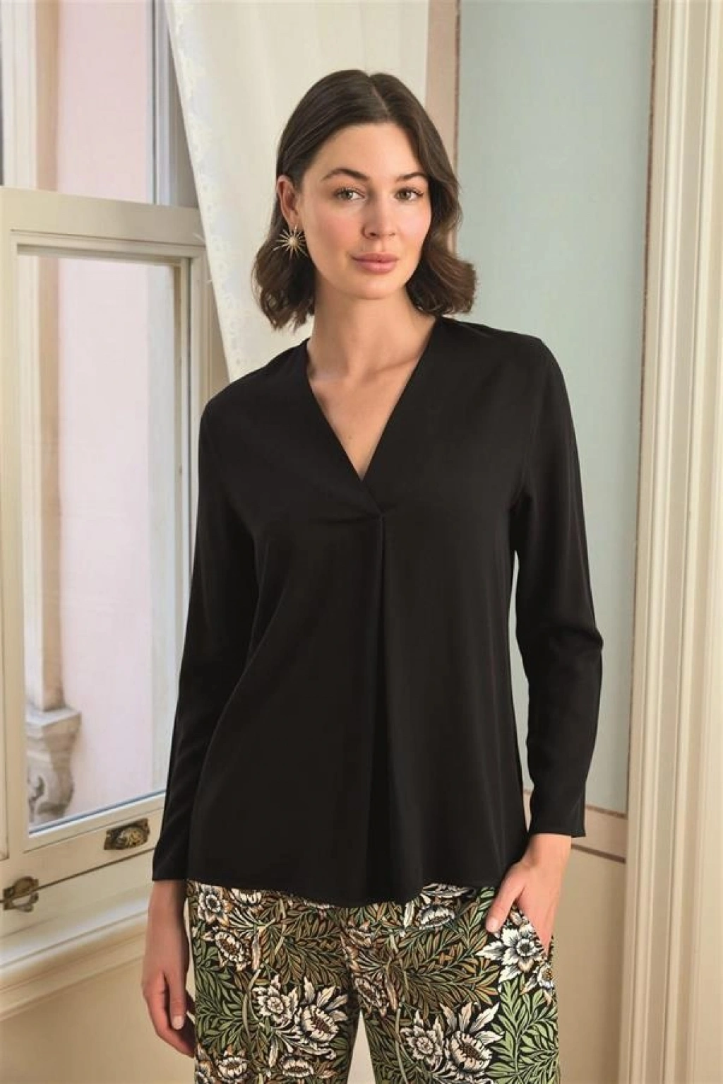 Üst: Siyah renklidir, V yakalıdır, uzun kolludur, dokuma kumaştır.