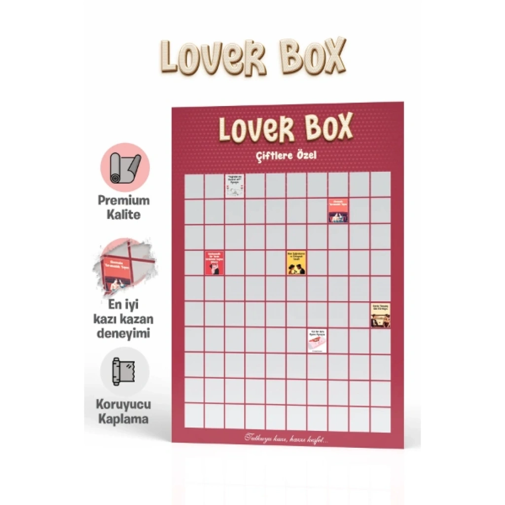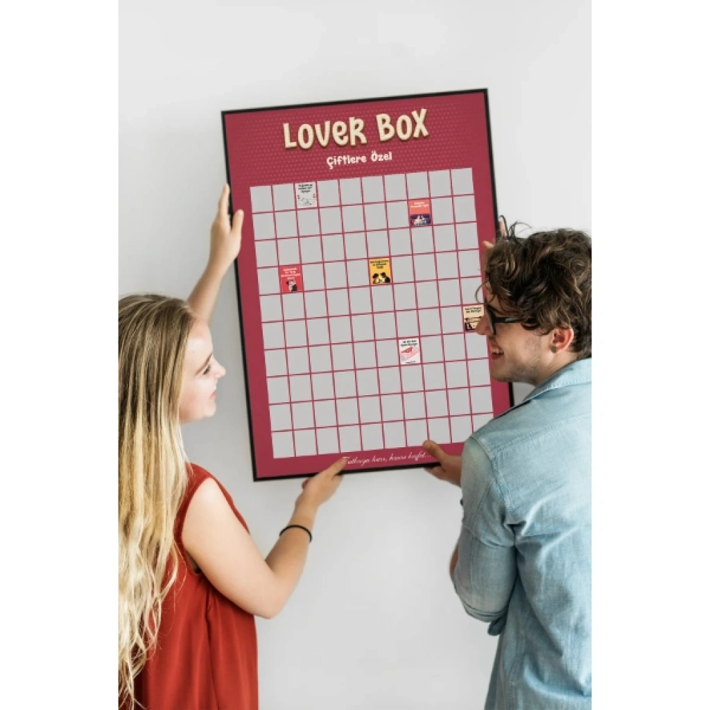 Çiftlere Özel Kazı Kazan Posteri, ilişkinize tutku, heyecan ve cesaret katmak için tasarlanmış özel bir interaktif deneyimdir. "Cesur Ol, Aşkınıza Renk Kat!" mottosuyla hazırlanan bu Lover Box serisi poster, çiftlerin rutinlerinden sıyrılarak birlikte keşfedecekleri 100 farklı sürpriz görevi ve aktiviteyi barındırır. Premium kalitede kağıt ve özel koruyucu kaplama ile üretilen poster, her kazımada altındaki renkli illüstrasyonları zarar görmeden ortaya çıkarır. Gümüş kazınabilir katmanın altında gizlenen özel görevler, partnerinizle olan bağınızı güçlendirirken unutulmaz anılar biriktirmenizi sağlar. Şık bordro tasarımıyla yatak odanızda estetik bir dekoratif aksesuar olarak yerini alacak olan bu poster, sadece bir oyun değil, aynı zamanda ilişkinizi taze tutacak bir macera rehberidir. Özel silindir kutusu veya şık kutu tasarımıyla gönderilen bu ürün, partnerine alışılmışın dışında, heyecan verici bir hediye vermek isteyenler için mükemmel bir tercihtir. Ürün Teknik Özellikleri ÖzellikAçıklama Ürün AdıÇiftlere Özel Kazı Kazan Posteri İçerik100 Farklı Cesur ve Eğlenceli Görev MateryalYüksek Kaliteli Mat Kuşe Kağıt KaplamaKoruyucu Özel Katman ve Gümüş Kazınabilir Yüzey TasarımLover Box Çiftlere Özel Seri, Bordro Renk Paleti Fonksiyonİnteraktif İlişki Oyunu ve Dekoratif Tablo Hediye KonseptiSevgililer Günü, Yıl Dönümü, Partner Hediyesi Paket İçeriği1 Adet Çiftlere Özel Kazı Kazan Posteri (Özel Kutusunda)