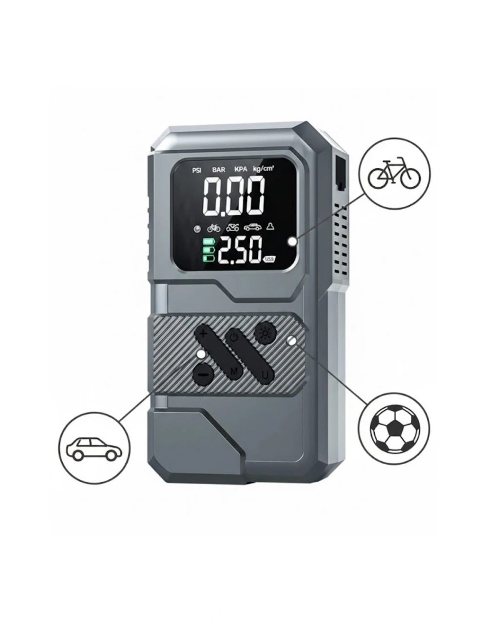 Araç kullanıcılarının yolda karşılaşabileceği beklenmedik durumlar göz önünde bulundurularak tasarlanan bu çok fonksiyonlu cihaz, pratikliği ve çok yönlü kullanımıyla öne çıkar. Akü takviye, lastik şişirme, aydınlatma ve powerbank özelliklerini tek bir gövdede birleştirmesi sayesinde araç içerisinde ayrı ayrı ekipman taşıma ihtiyacını ortadan kaldırır. 12.000 mAh kapasiteli dahili bataryası, günlük kullanımda ve acil durumlarda yeterli enerji desteği sunar.Akü takviye fonksiyonu, 12V araç sistemleriyle uyumlu olacak şekilde geliştirilmiştir. Uzun süre park halinde kalan veya soğuk havalarda aküsü zayıflayan araçlar için destekleyici bir çözüm sunar. Kullanımı pratik olan bu özellik, sürücünün yolda kalma riskini azaltmaya yardımcı olur. Lastik şişirme özelliği ise dijital hava kompresörü ile desteklenmiştir. Basınç değerlerinin ekrandan takip edilebilmesi, lastiklerin ideal seviyede şişirilmesini kolaylaştırır ve güvenli sürüşe katkı sağlar.LED aydınlatma sistemi, gece kullanımı ve düşük ışıklı ortamlarda büyük bir avantaj sunar. Yol kenarında yapılan müdahalelerde ortamın aydınlatılmasına yardımcı olurken, acil durumlarda görünürlüğü artırır. Powerbank fonksiyonu sayesinde telefon, navigasyon cihazı ve diğer elektronik ürünler USB çıkışı üzerinden şarj edilebilir. Bu özellik, özellikle uzun yolculuklarda ve elektrik erişiminin sınırlı olduğu durumlarda oldukça kullanışlıdır.Kompakt ve dayanıklı gövde yapısı sayesinde araç içerisinde rahatça taşınabilir. Taşıma kesesi ile düzenli bir saklama imkânı sunar. Araçta, evde veya seyahatlerde kullanıma uygun olan bu ürün, çok yönlü yapısıyla hem bireysel kullanıcılar hem de sık seyahat edenler için ideal bir yardımcıdır.