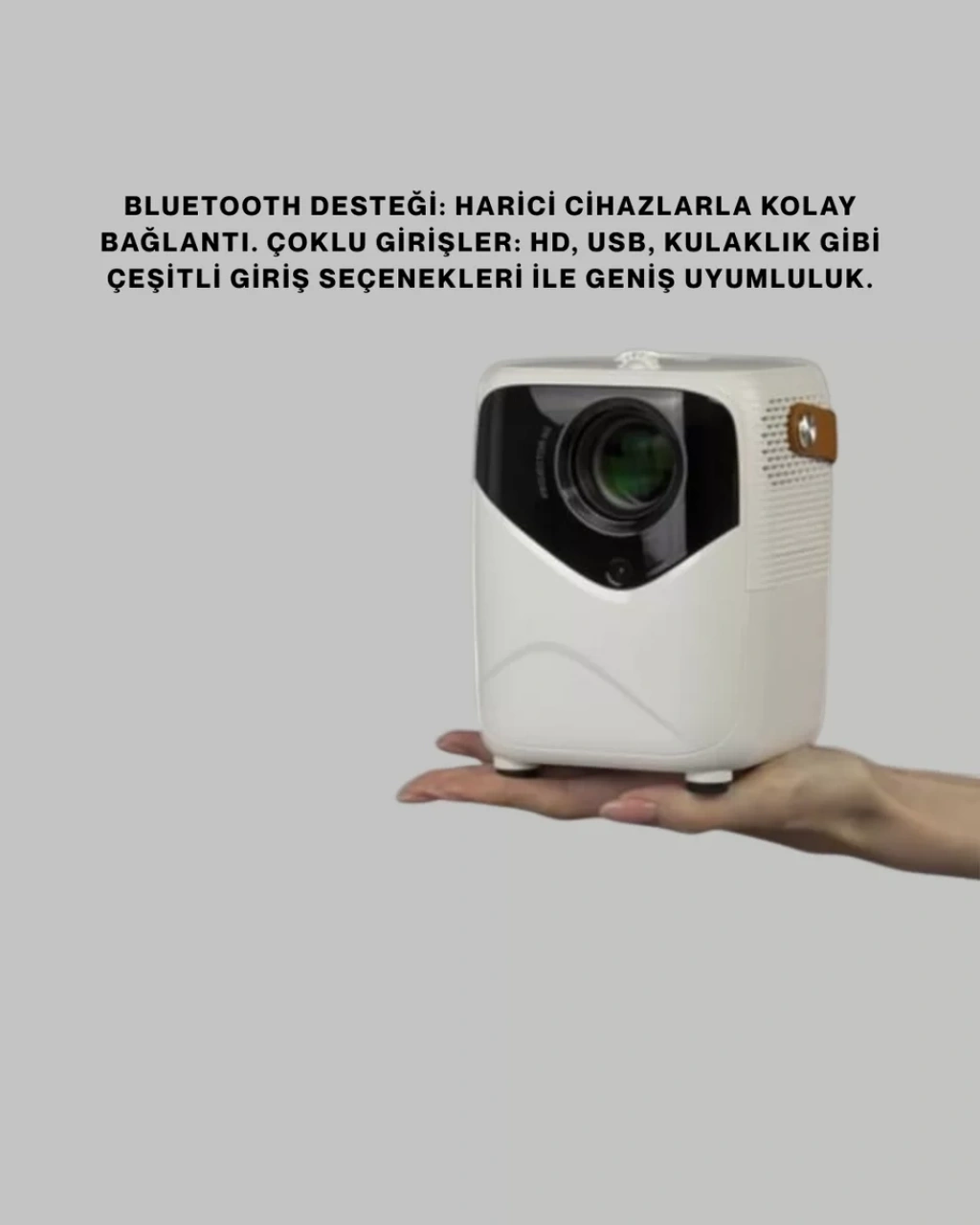Bu mini projektör, farklı cihazlarla kolay bağlantı kurabilmeniz için çoklu giriş seçenekleri ile donatılmıştır. HDMI, USB, kulaklık girişleri sayesinde ister bilgisayar, ister tablet, oyun konsolu, kamera ya da harici bellek bağlayabilirsiniz.USB girişi, harici disk ya da flash bellekten medya oynatmaya olanak tanırken, HDMI bağlantısı yüksek çözünürlüklü cihazlardan görüntü almanızı sağlar. Kulaklık çıkışı ise kişisel izleme deneyimi yaşamak isteyen kullanıcılar için birebirdir.Bluetooth desteği ile ses sistemleri ya da kablosuz kontrol birimleri kolayca eşleştirilebilir. Bu özellik, projeksiyon cihazını sadece görüntü değil ses ve kontrol anlamında da özgürce kullanma imkanı tanır.İşlevsel giriş sisteminin yanı sıra, cihazın kurulumu oldukça pratiktir. Elektrik kablosuyla doğrudan prize takılarak çalışır. Ekstra yazılım ya da sürücü kurulumuna ihtiyaç duymaz.Bu çok yönlü bağlantı desteği, cihazı hem ev eğlencesinde hem iş ortamlarında ideal hale getirir.