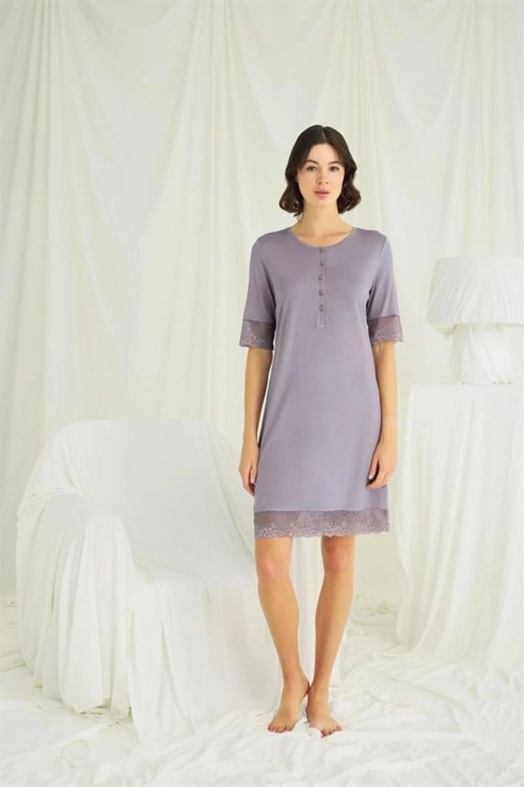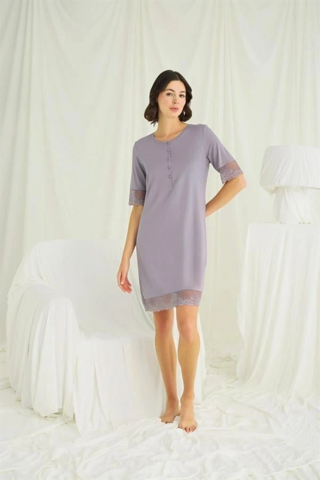 Gecelik: Bisiklet yakalıdır, kısa kolludur, önü düğmelidir, kol ağzı ve etek kısmı dantellidir, gri renklidir, örme kumaştır.