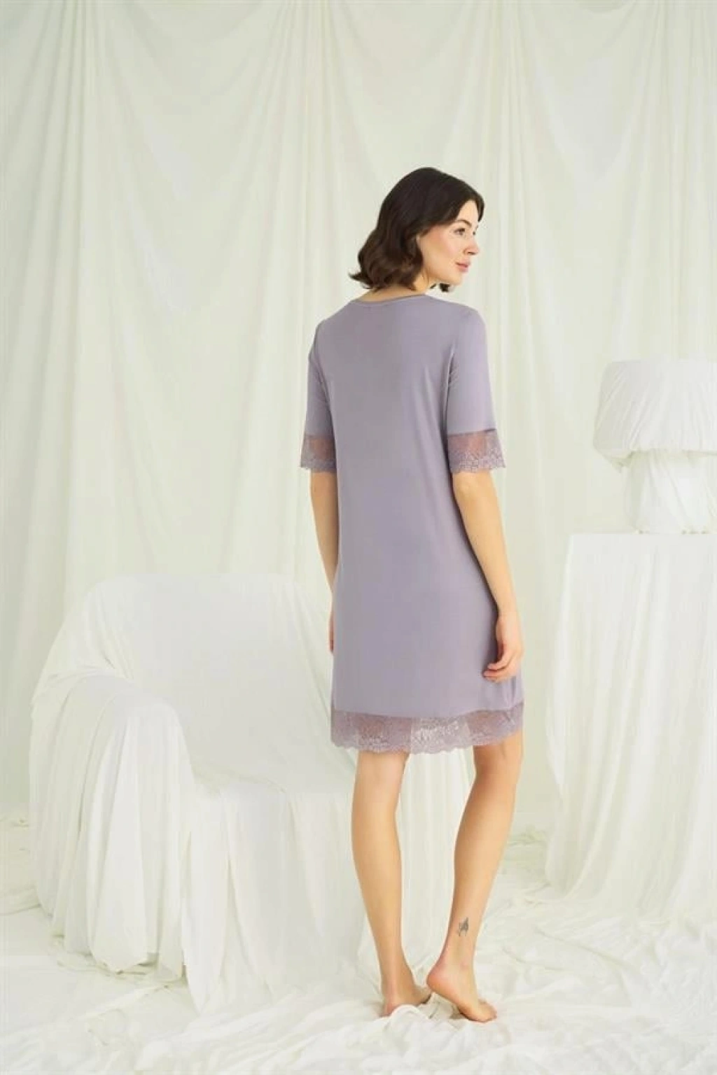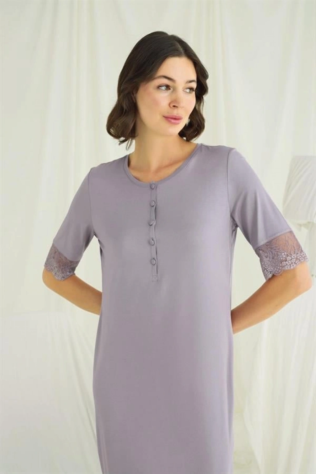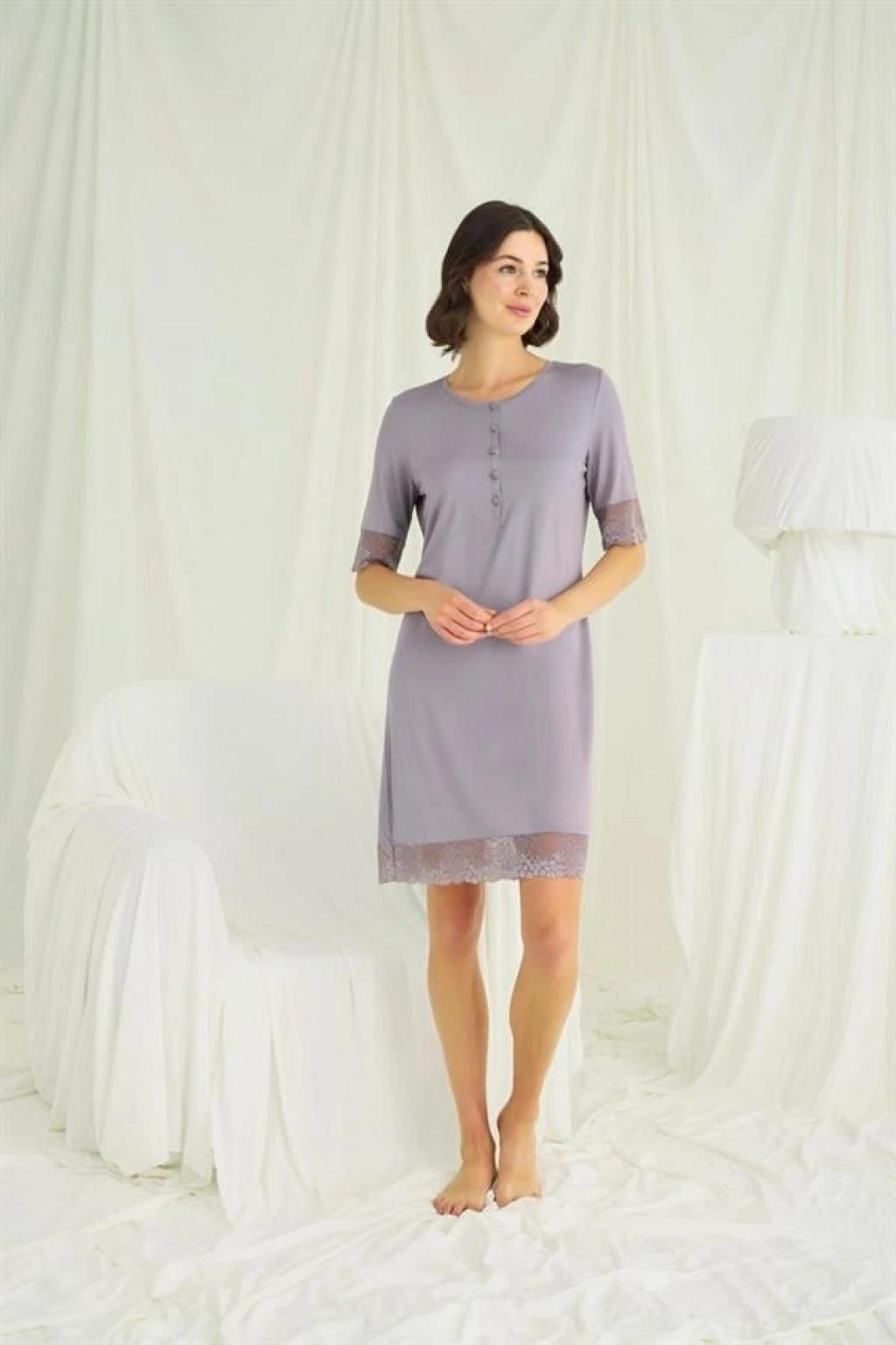 Gecelik: Bisiklet yakalıdır, kısa kolludur, önü düğmelidir, kol ağzı ve etek kısmı dantellidir, gri renklidir, örme kumaştır.