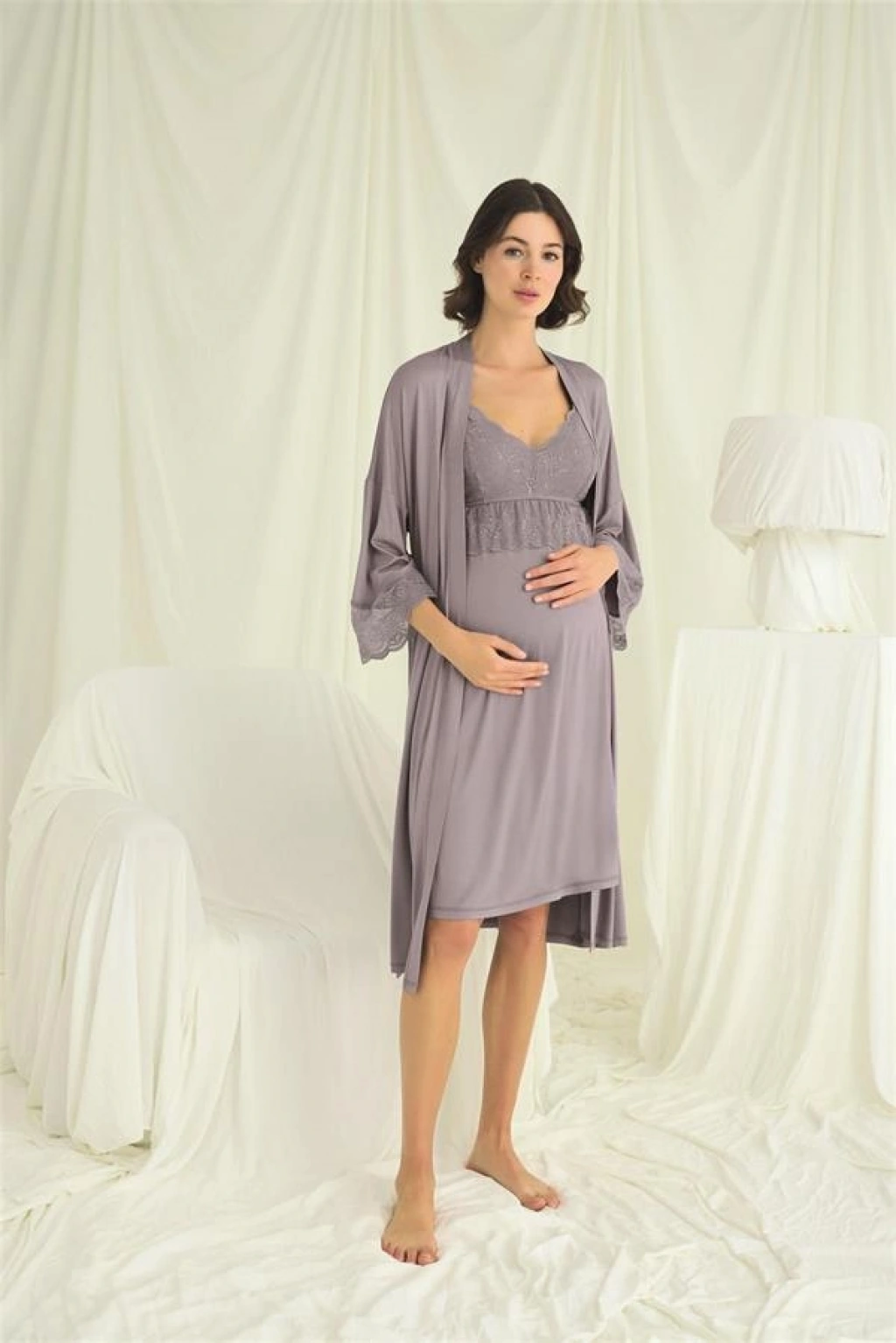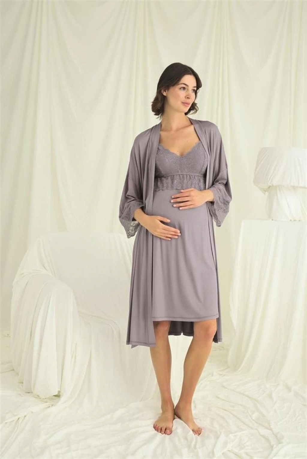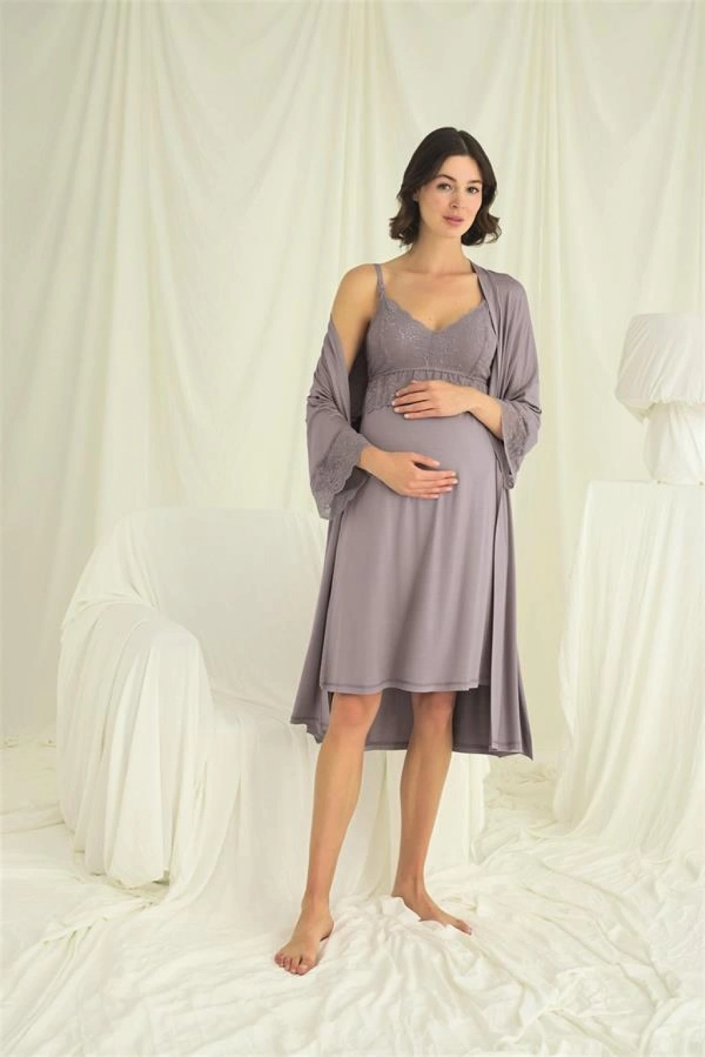 Gecelik: Gri renklidir, derin V yakalıdır, yakası, göğsü ve göğüs altı dantellidir, emzirme için askılardan açılır durumdadır, ayarlanabilir lastik askılıdır, örme kumaştır.