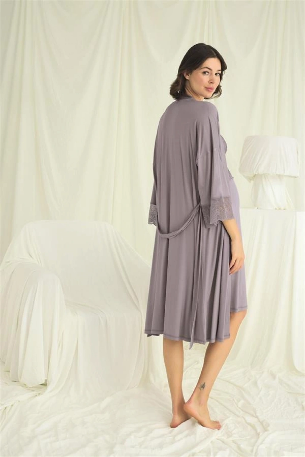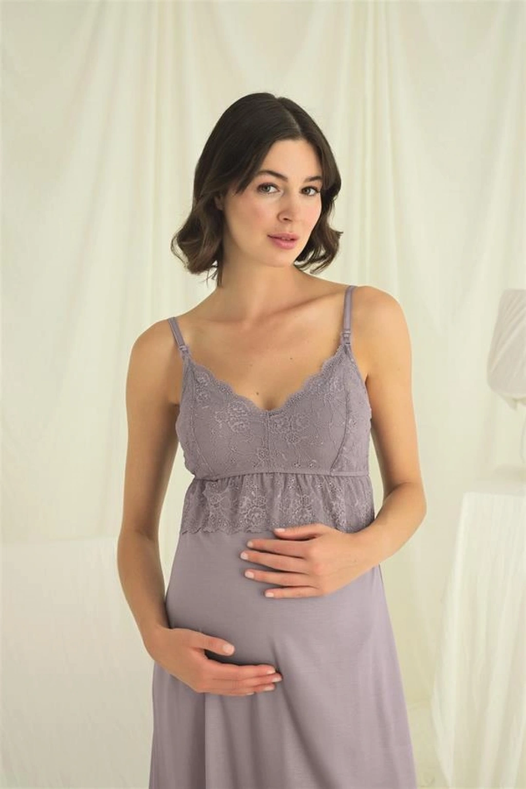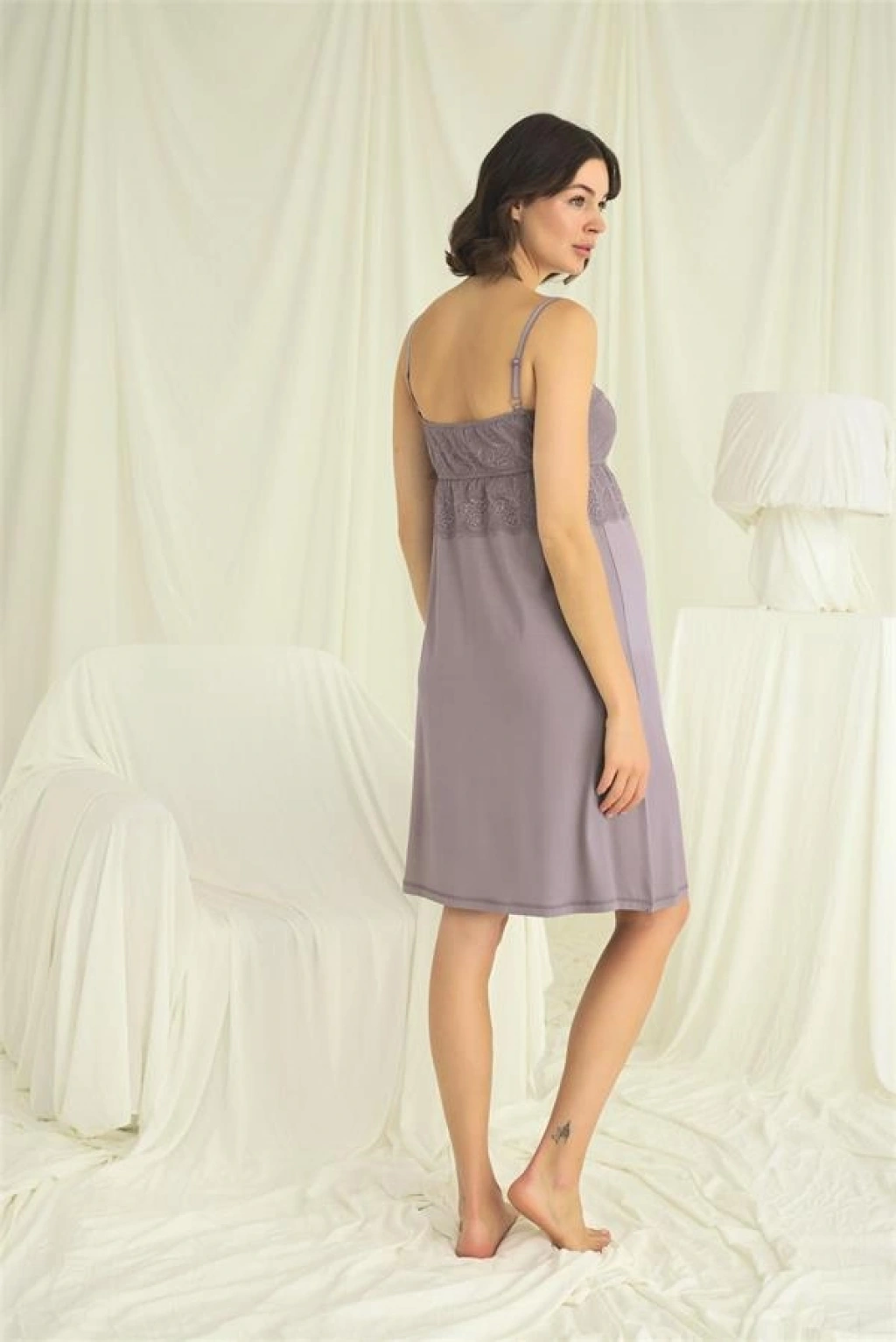 Gecelik: Gri renklidir, derin V yakalıdır, yakası, göğsü ve göğüs altı dantellidir, emzirme için askılardan açılır durumdadır, ayarlanabilir lastik askılıdır, örme kumaştır.