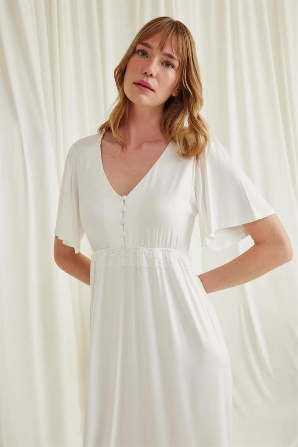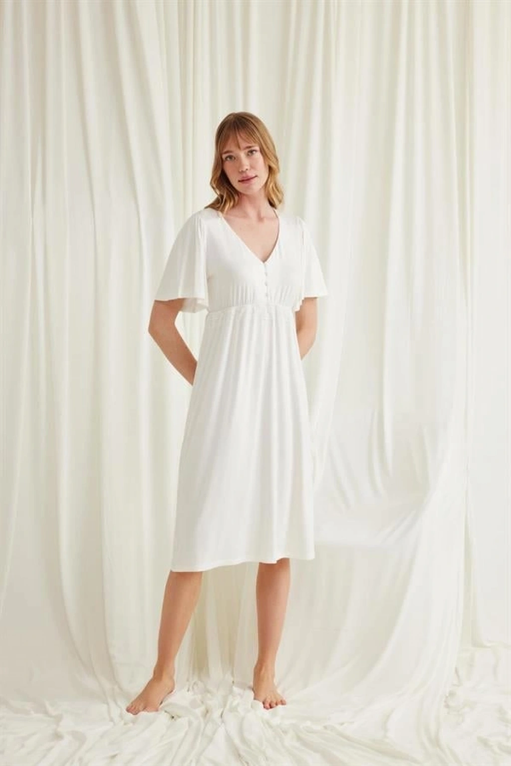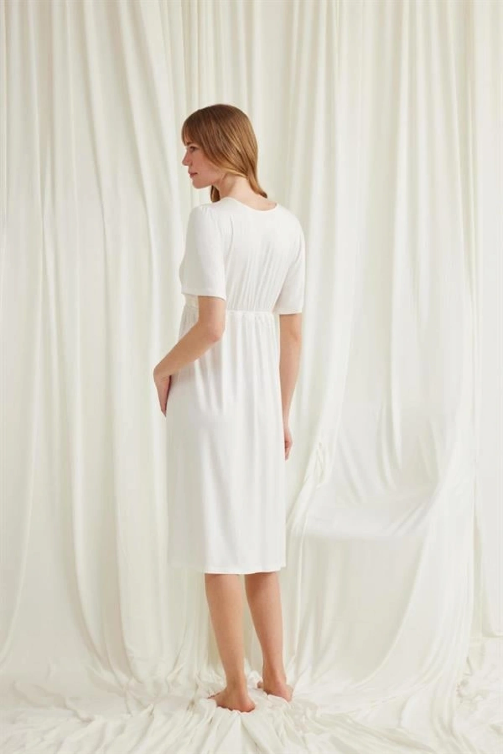 Gecelik: Ekru renklidir, V yakalıdır, kolu ve beli dantellidir, yakasının altı düğmelidir, emzirme için düğmelerden açılır durumdadır, kısa kolludur, örme kumaştır.