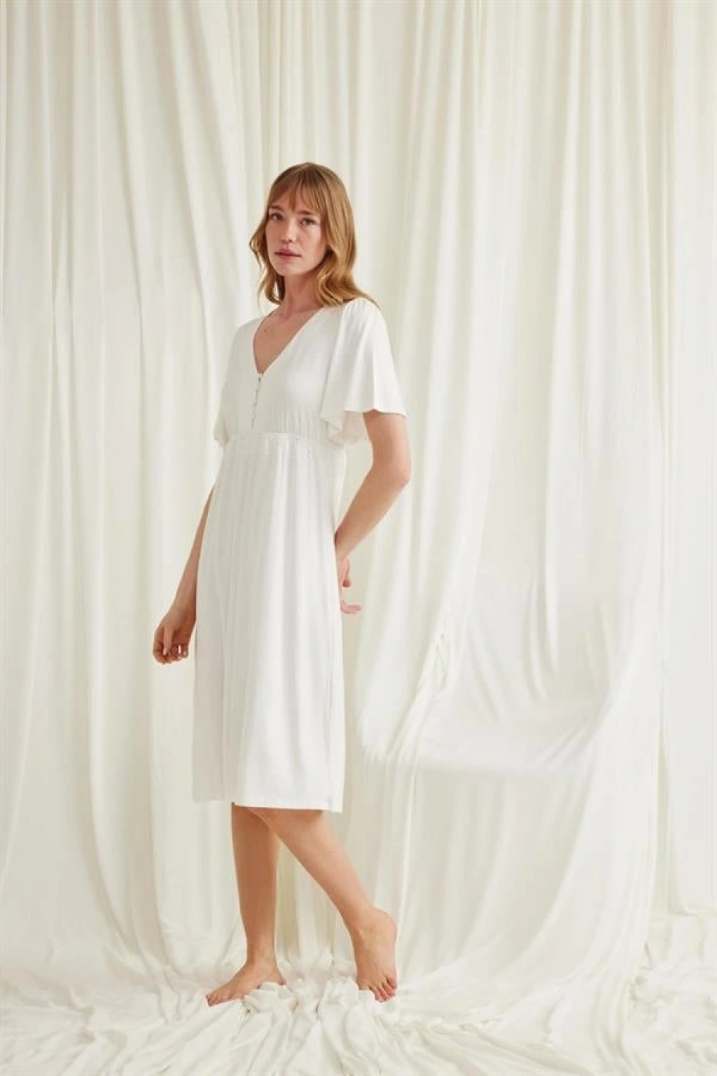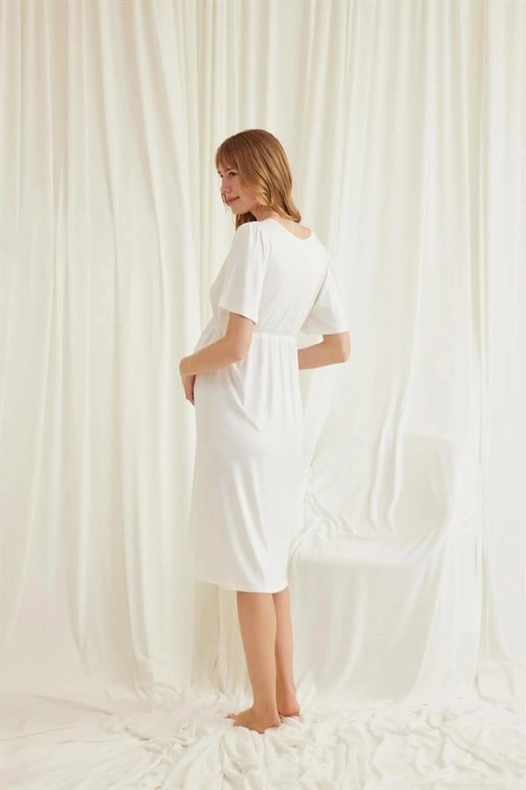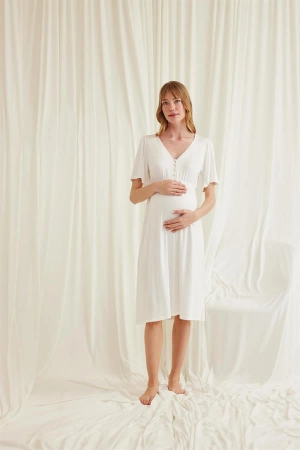 Gecelik: Ekru renklidir, V yakalıdır, kolu ve beli dantellidir, yakasının altı düğmelidir, emzirme için düğmelerden açılır durumdadır, kısa kolludur, örme kumaştır.