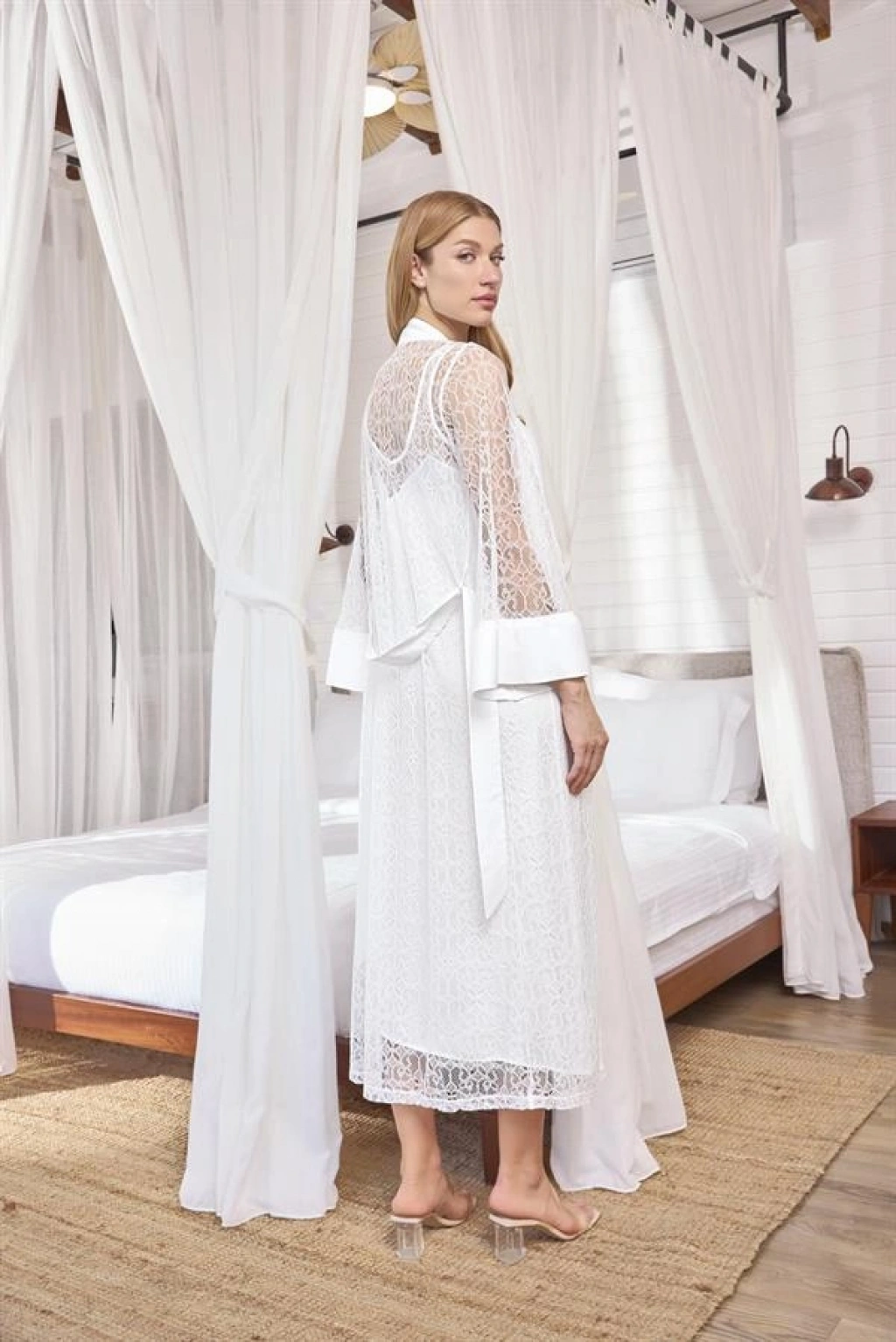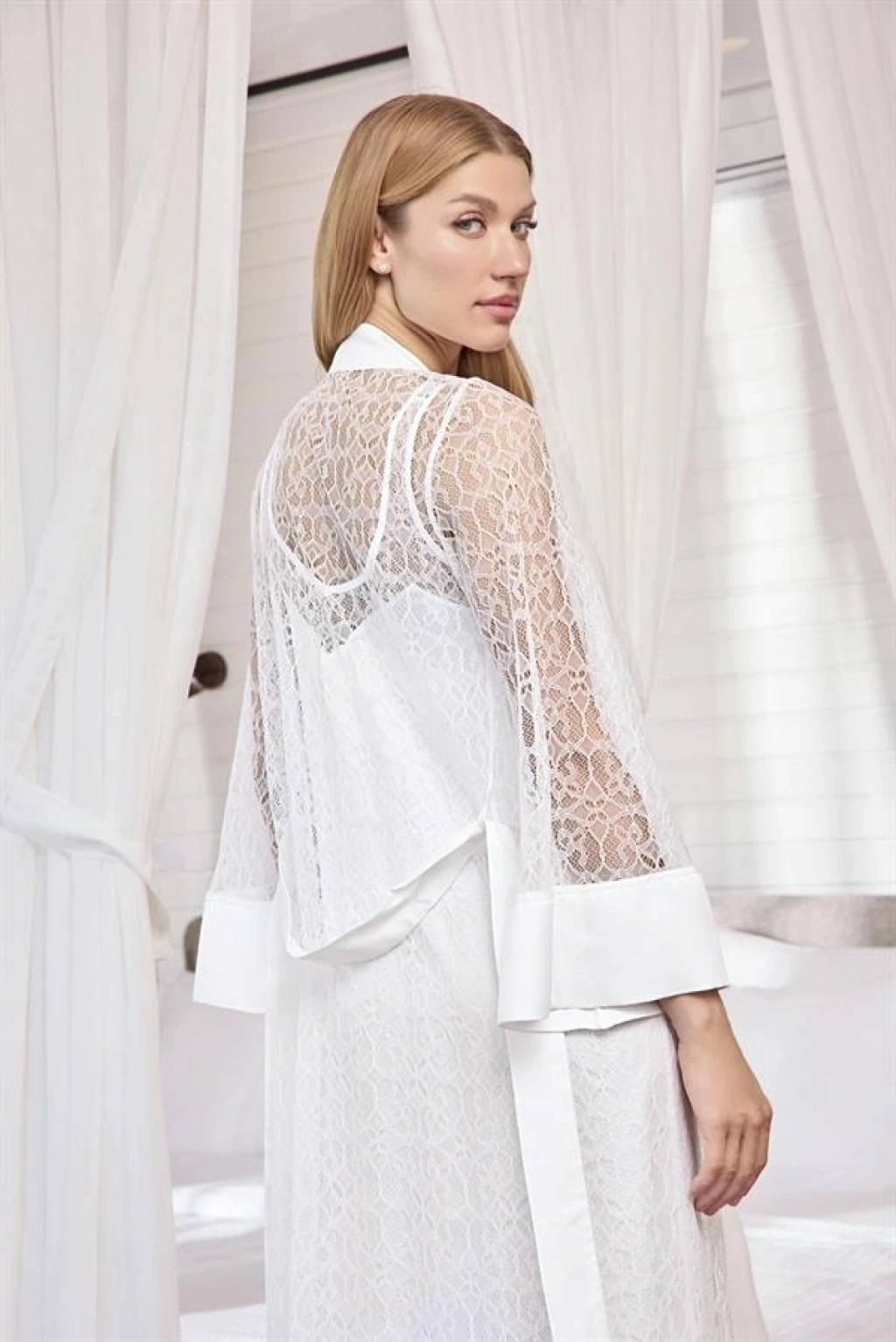 Gecelik: Beyaz renklidir, derin V yakalıdır, sırt ve göğüs dekoltelidir, yakası dantellidir, kalın askılıdır, dokuma kumaştır.