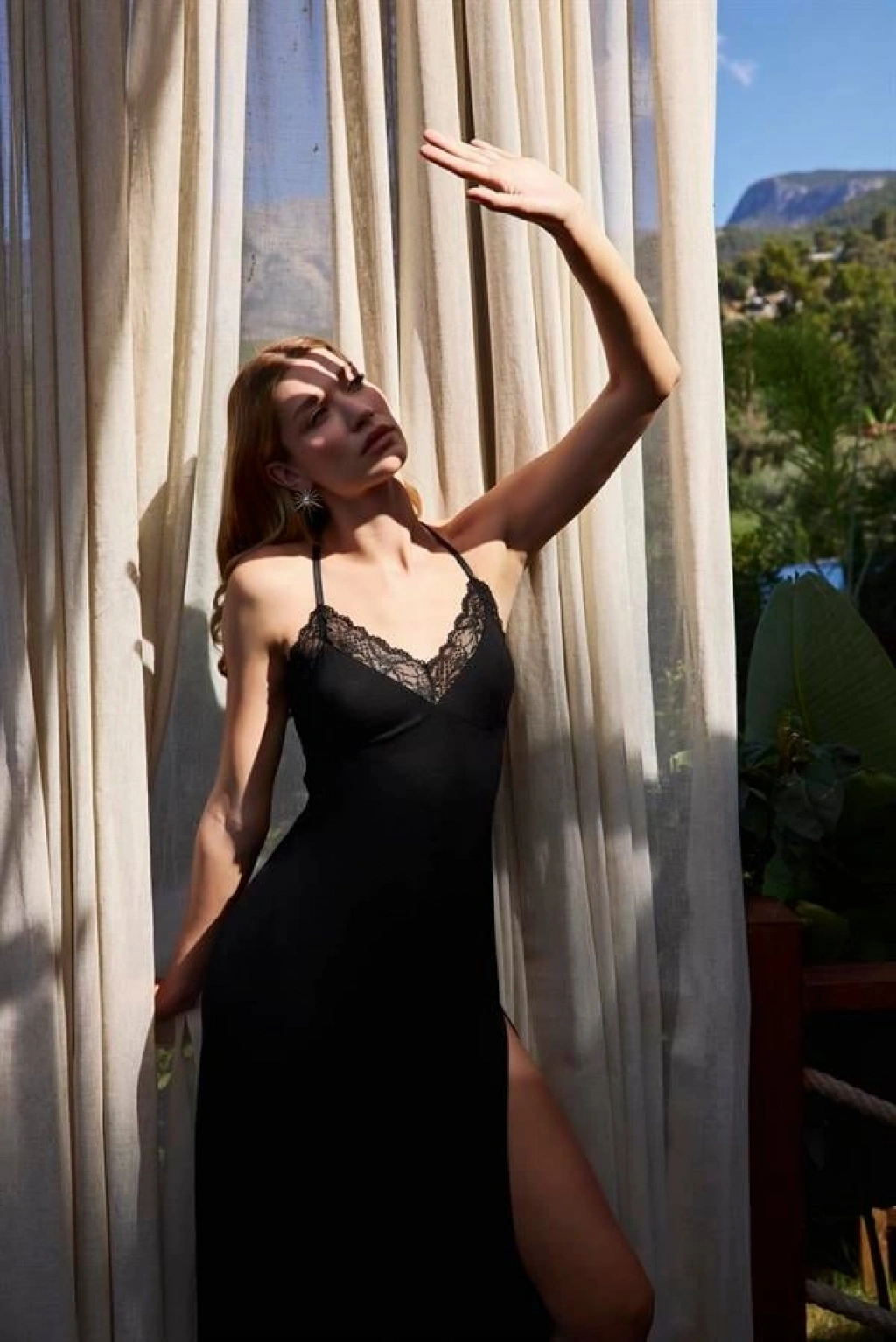 Gecelik: Siyah renklidir, derin V Yakalıdır, göğüs ve sırt dekoltelidir, ayalanabilir ip askılıdır, yakası ve göğüs kenarları ile sırtı dantellidir, yırtmaçlıdır, örme kumaştır.