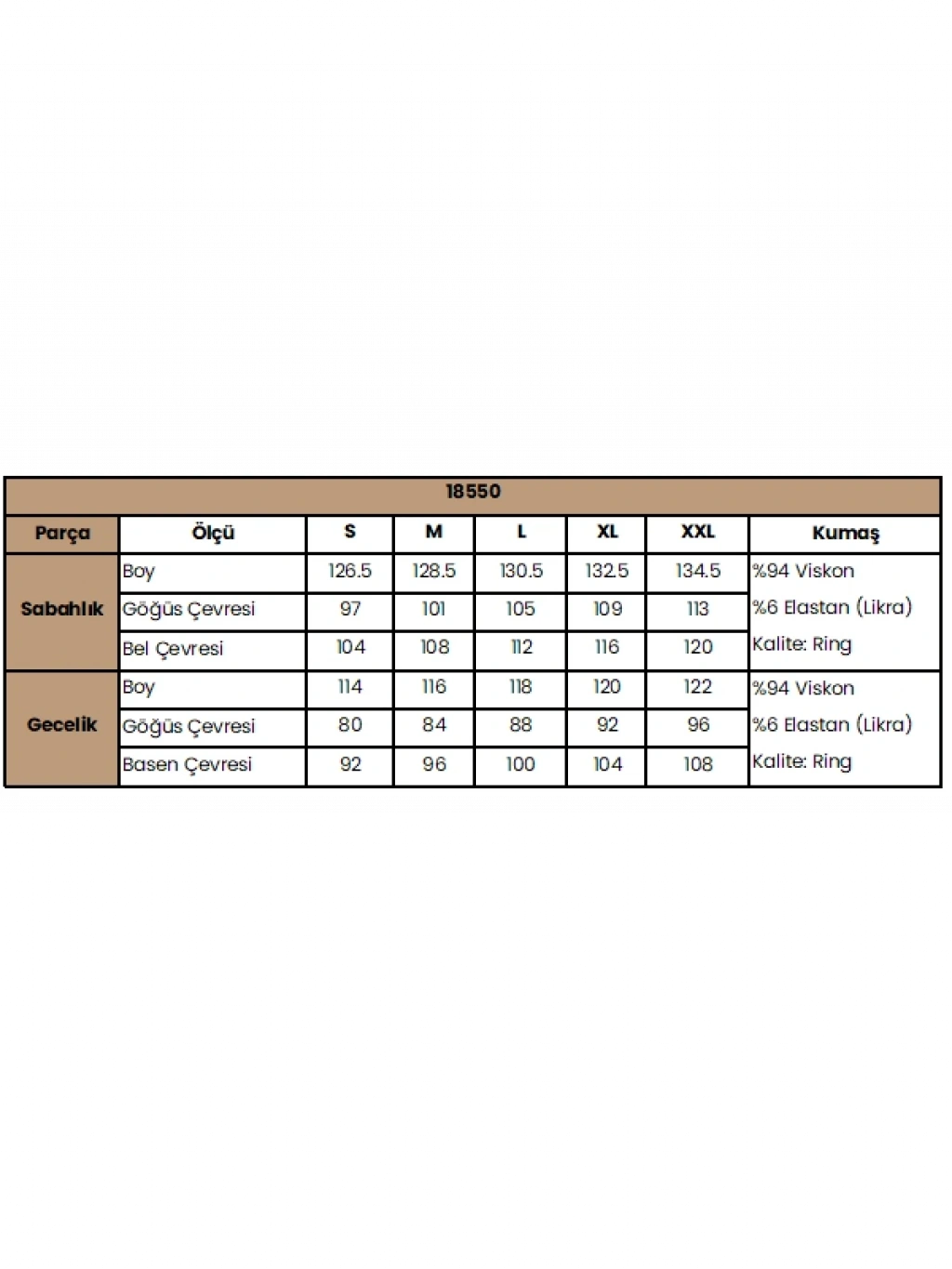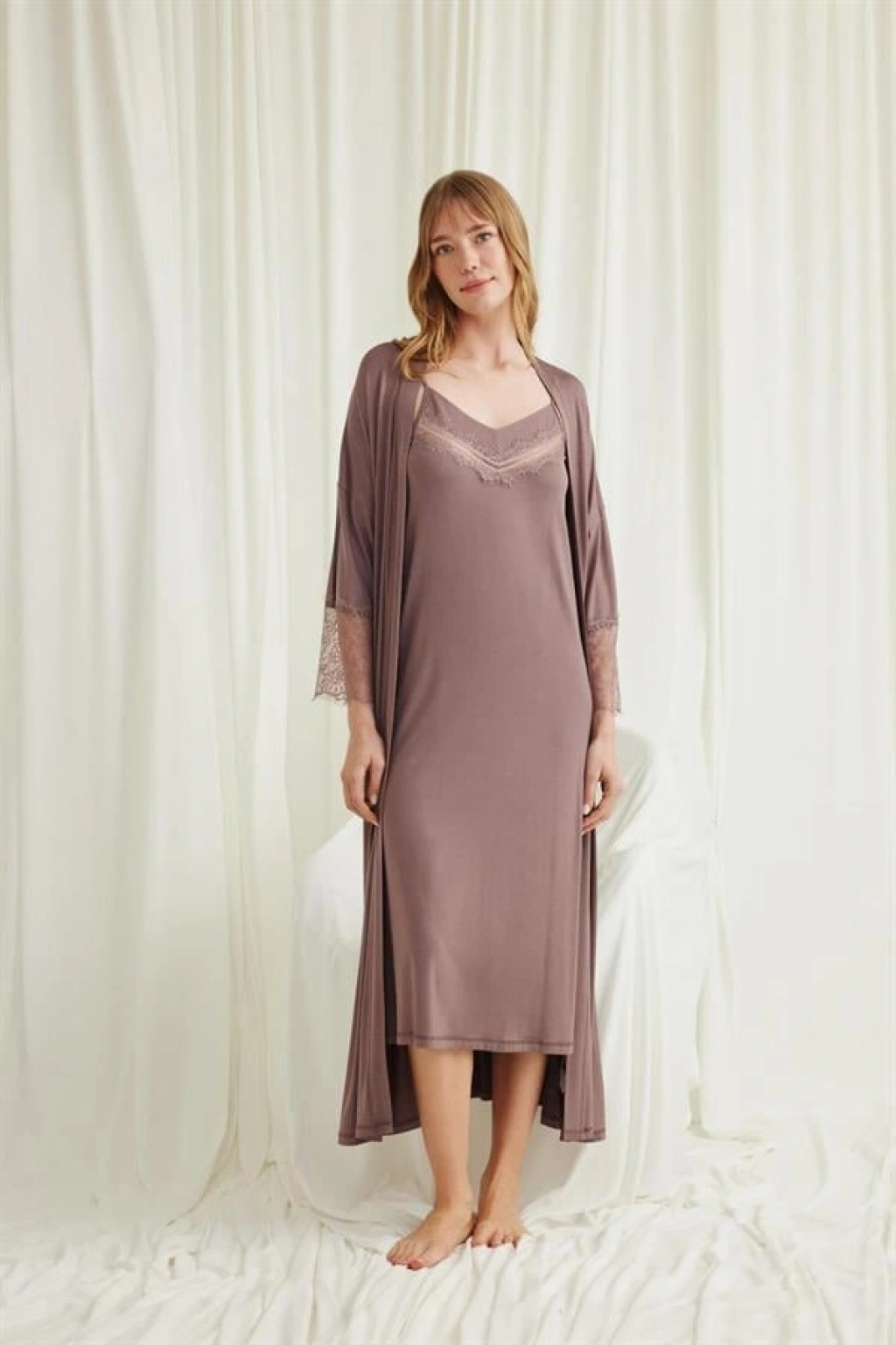 Gecelik: Kahverengi renklidir, ayarlanabilir ip askılıdır, derin V yaka dekoltelidir, göğüs kısmı dantellidir, örme kumaştır.