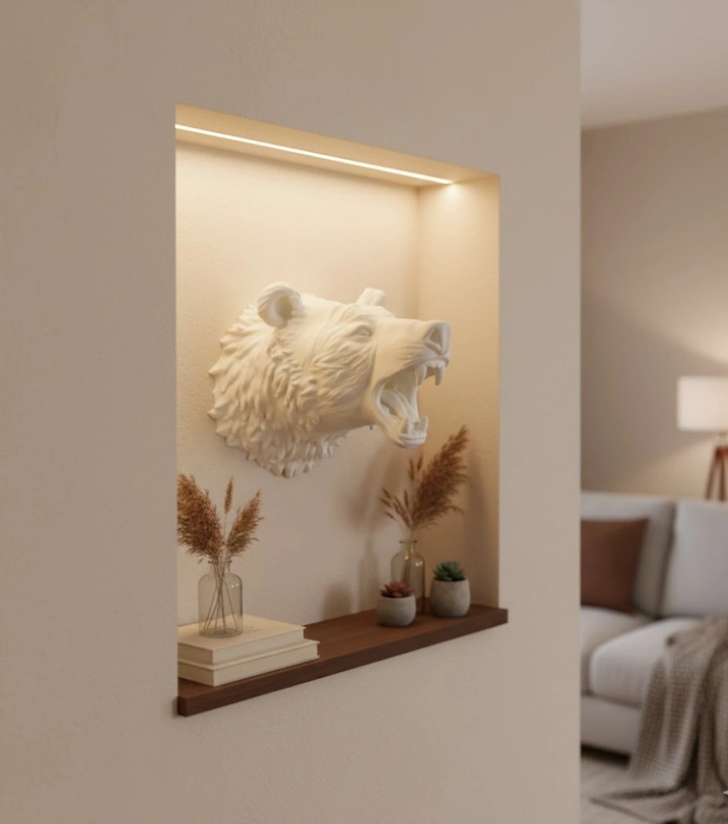 Beyaz 3D ayı başı duvar heykeli, dekorasyonuna modern, etkileyici ve güçlü bir dokunuş eklemek isteyenler için özel olarak tasarlanmış bir üründür. 25x19 cm ölçülerindeki bu dekoratif figür, beyaz renginin sadeliği ve şıklığı ile hem modern hem de minimal dekorasyon tarzlarına mükemmel uyum sağlar. Ürünün detaylı yüz hatları dikkat çekici bir gerçekçilik sunarken, 3 boyutlu kabartı yapısı duvarda güçlü bir gölge etkisi oluşturur.Hafif ve sağlam yapısı sayesinde kolayca duvara monte edilebilir. Odanın odak noktası olması için tek başına kullanılabileceği gibi, galeriler, çalışma odaları, genç odaları, ofisler veya tasarım ağırlıklı ortamlar için de harika bir tamamlayıcıdır. Ayı figürü; güç, cesaret ve koruyucu enerji ile ilişkilendirildiği için manevi anlamda bir sembol arayan kullanıcıların da ilk tercihleri arasında yer alır.Estetik tasarımı sayesinde fotoğraf çekimleri, video çekim alanları, stüdyo dekorasyonları veya mağaza vitrinlerinde de çok şık bir görünüm sağlar. Beyaz rengi, her renkteki duvar ile uyumlu olduğu için dekorasyon seçeneklerini genişletir.Ayrıca özel günler için benzersiz bir hediye seçeneğidir. Şık, farklı ve anlamı olan dekoratif objeler sevenler için ideal bir alternatiftir.