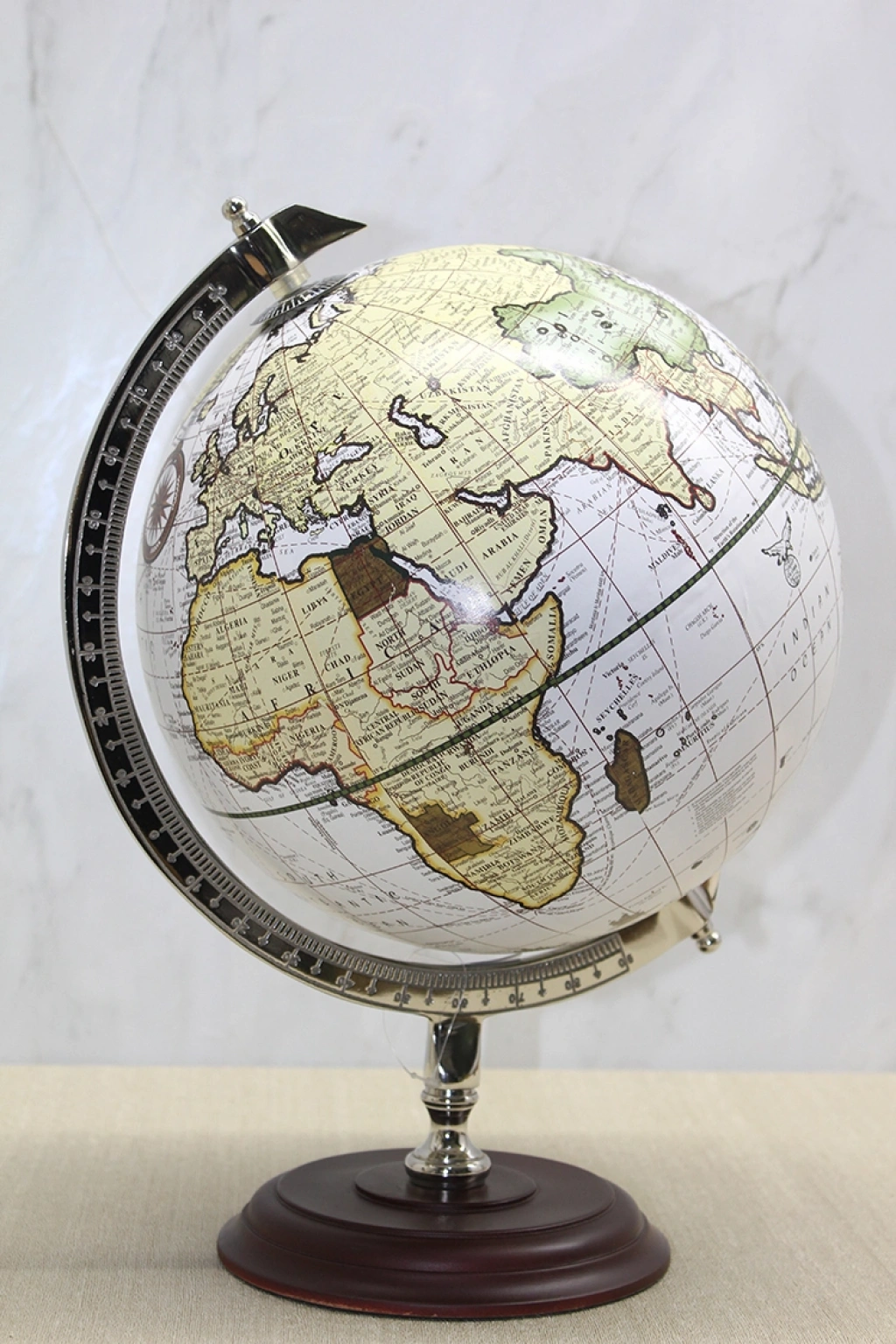 Dekoratif Masaüstü Dünya Küre - Model 15, açık krem ve bej tonlarının hâkim olduğu klasik atlas tasarımı ile zamansız bir dekoratif şıklık sunar. 40x30 cm ölçüsü sayesinde büyük boy formda tasarlanmış olup masa üzerinde güçlü ve dengeli bir duruş sergiler. Açık zemin üzerine işlenmiş kıta detayları, daha aydınlık ve ferah bir atlas görünümü oluştururken metal meridyen halkası ve koyu ahşap görünümlü kaide tasarımı ürüne klasik bir karakter kazandırır. büyük boy masaüstü dünya küre arayan kullanıcılar için ideal ölçüye sahip olan bu model, yönetici masası, ofis konsolu, salon sehpası ya da geniş kitaplık raflarında prestijli bir odak noktası oluşturur. Hem klasik hem modern dekorasyon stilleriyle uyum sağlayabilen dekoratif atlas dünya küresi, bulunduğu ortamda entelektüel ve sofistike bir atmosfer yaratmak isteyenler için estetik bir tercihtir. Sağlam stand yapısı sayesinde dengeli kullanım sunar ve uzun süreli dekoratif kullanım için uygundur. Ürün Teknik Özellikleri ÖzellikAçıklama Ürün AdıDekoratif Masaüstü Dünya Küre - Model 15 Boyut40 x 30 cm Kullanım TürüMasaüstü TasarımAçık Krem Tonlu Atlas Kullanım AlanıEv, Ofis, Yönetici Masası Paket İçeriği1 Adet Dekoratif Masaüstü Dünya Küre - Model 15