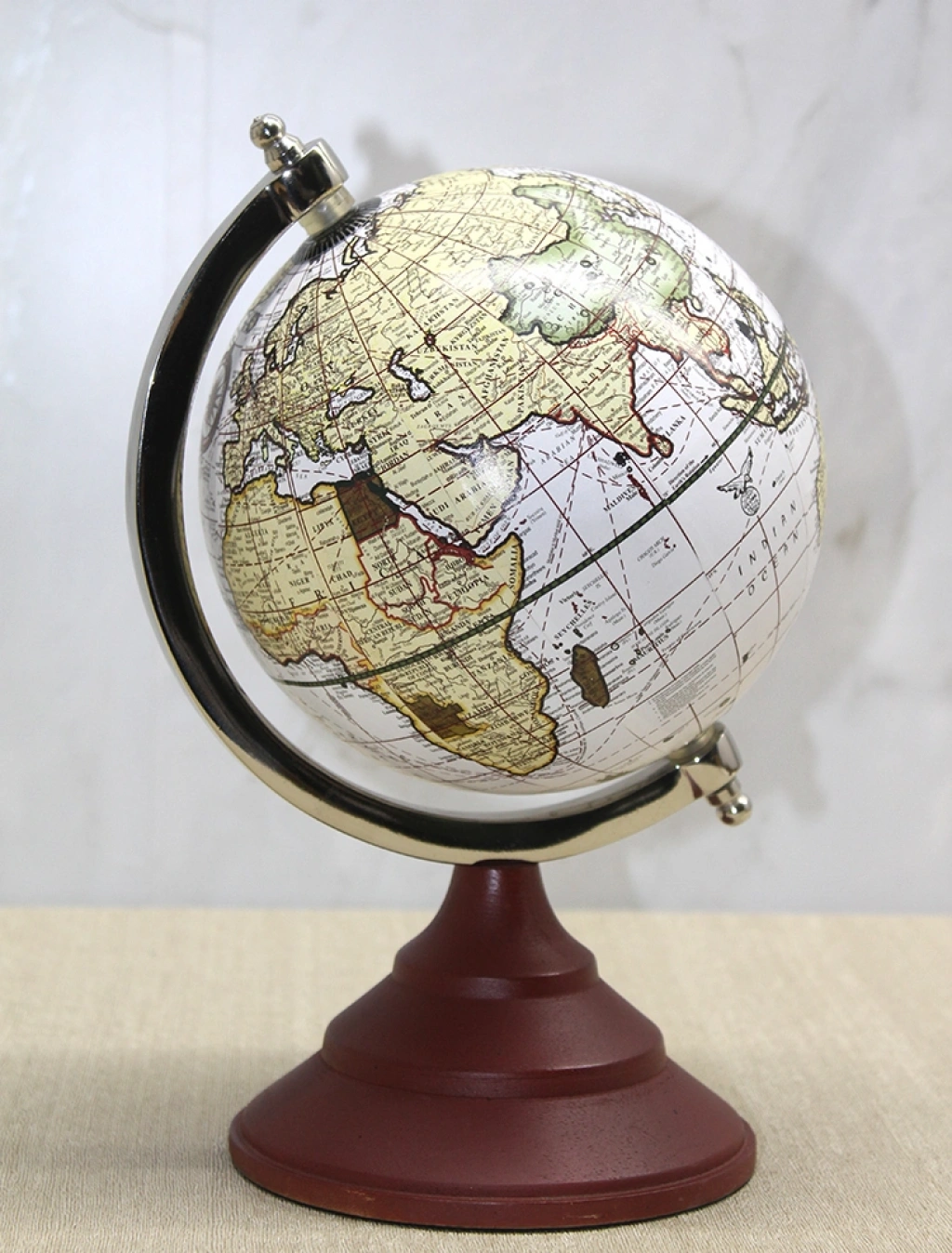 Dekoratif Masaüstü Dünya Küre - Model 17, krem ve bej tonlarının hâkim olduğu klasik atlas tasarımı ile nostaljik ve zarif bir dekoratif görünüm sunar. 26x17 cm ölçüsü sayesinde orta boy kompakt yapıda olup masa üzerinde dengeli bir duruş sergiler ve alanı kalabalıklaştırmadan şık bir tamamlayıcı olur. Açık tonlu harita zemini, kıta detaylarını yumuşak geçişlerle öne çıkarırken koyu ahşap görünümlü kaide ve metal meridyen halkası tasarımı ürüne klasik bir karakter kazandırır. klasik atlas dünya küre arayan kullanıcılar için hem estetik hem de ölçü açısından ideal bir alternatif sunar. Çalışma masası, kitaplık, ofis sehpası veya salon konsolu üzerinde rahatlıkla konumlandırılabilir. masaüstü dekoratif dünya küresi, bulunduğu ortama entelektüel bir atmosfer katarken dekorasyonunuzu tamamlayan zamansız bir aksesuar olarak öne çıkar. Dengeli stand yapısı sayesinde sağlam durur ve uzun süreli dekoratif kullanım için uygundur. Ürün Teknik Özellikleri ÖzellikAçıklama Ürün AdıDekoratif Masaüstü Dünya Küre - Model 17 Boyut26 x 17 cm Kullanım TürüMasaüstü TasarımKrem Tonlu Klasik Atlas Kullanım AlanıEv, Ofis, Çalışma Alanı Paket İçeriği1 Adet Dekoratif Masaüstü Dünya Küre - Model 17