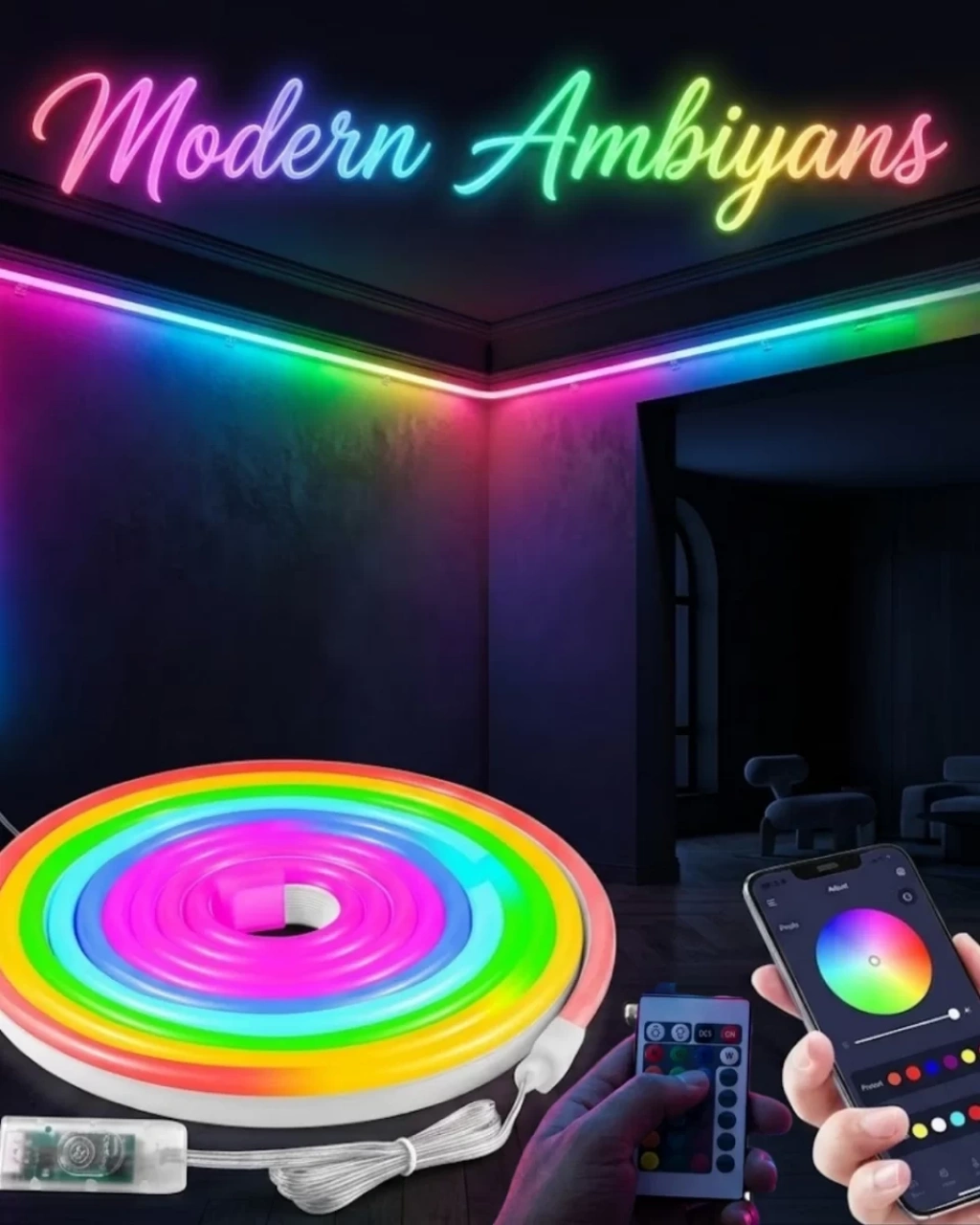 Dekoratif RGB neon LED şerit ışık, modern aydınlatma ihtiyaçlarını karşılamak için geliştirilmiş pratik ve estetik bir LED ışık çözümüdür. 3 metre uzunluğundaki esnek neon şerit tasarımı sayesinde farklı alanlara kolayca uygulanabilir ve bulunduğu ortama dikkat çekici bir ambiyans kazandırır. Ev dekorasyonu, televizyon arkasındaki ambiyans ışığı, bilgisayar masası aydınlatması, raf dekorasyonu veya oyun odası atmosferi gibi birçok alanda kullanılabilir.RGB LED teknolojisi sayesinde bu ürün geniş bir renk seçeneği sunar. Kullanıcılar farklı renk modları arasında geçiş yaparak istedikleri ortam atmosferini oluşturabilir. Renk geçiş efektleri sayesinde ışıklar yumuşak ve akıcı bir şekilde değişir ve ortama modern bir görünüm kazandırır.Akıllı kontrol özelliği sayesinde kullanıcılar LED şerit ışığı hem uzaktan kumanda hem de mobil uygulama aracılığıyla kontrol edebilir. Uzaktan kumanda sayesinde hızlı bir şekilde ışıkları açıp kapatabilir, farklı renk modlarını seçebilir ve parlaklık seviyesini ayarlayabilirsiniz. Mobil uygulama ise daha gelişmiş kontrol seçenekleri sunar ve kullanıcıların ışık efektlerini daha detaylı şekilde ayarlamasına olanak tanır.USB bağlantı özelliği ürünün kullanımını oldukça pratik hale getirir. LED şerit ışık bilgisayar USB portu, adaptör veya taşınabilir güç kaynaklarıyla çalışabilir. Bu özellik kullanıcıların ürünü farklı alanlarda rahatlıkla kullanabilmesini sağlar.Esnek neon yapısı sayesinde LED şerit ışık farklı yüzeylere kolayca uygulanabilir. Şerit tasarım sayesinde köşelerden geçebilir ve dekoratif şekiller oluşturmak için kullanılabilir. Ayrıca suya dayanıklı yapısı sayesinde hem iç mekan hem de dış mekan kullanımına uygun bir yapı sunar.Modern tasarımı ve geniş kullanım alanı sayesinde RGB neon LED şerit ışık, yaşam alanlarına dekoratif bir dokunuş kazandırmak isteyen kullanıcılar için ideal bir aydınlatma çözümüdür.