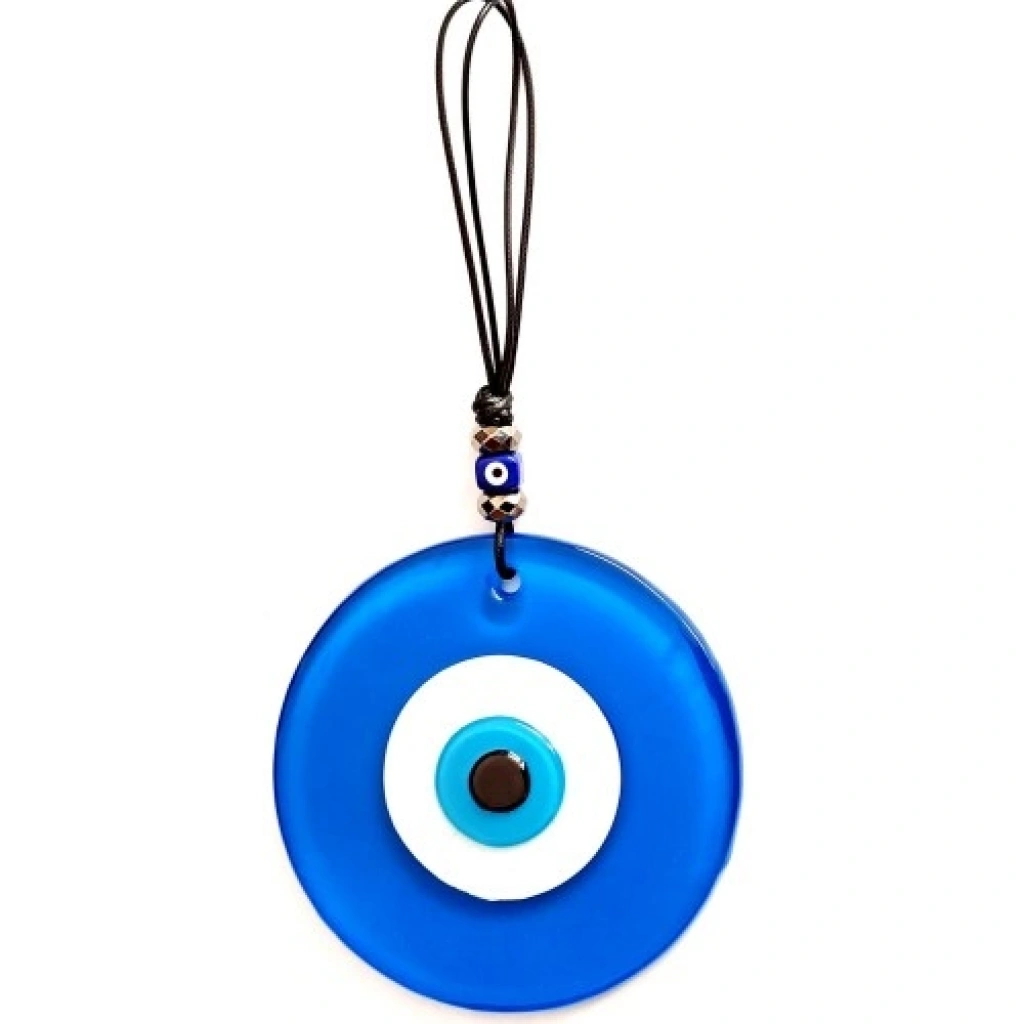 Tamamen el işçiliği ile üretilmiştir Cam nazar boncuğu ve küçük nazar boncuk detayları Deri ip tasarım Renk: Mavi tonları Nazar boncuğu çapı: 12 cm Toplam uzunluk (ip dahil): 26 cm Dekoratif ve hediyelik kullanım için uygundur