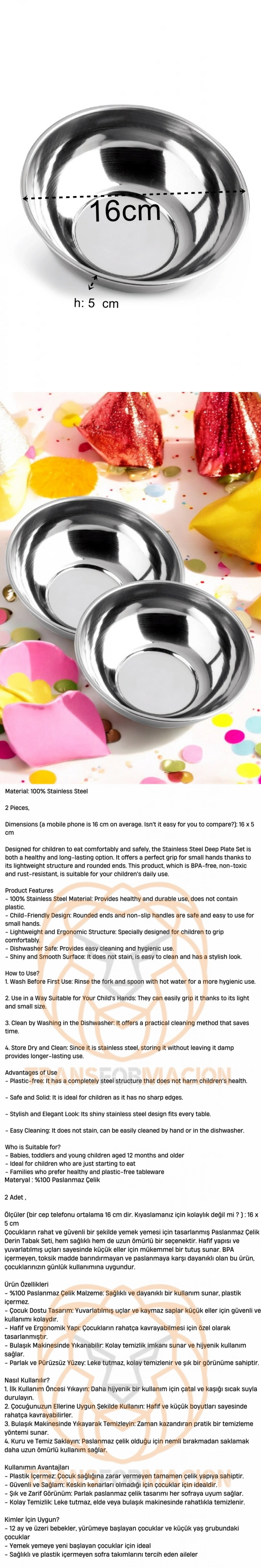 Çocukların rahat ve güvenli bir şekilde yemek yemesi için tasarlanmış Paslanmaz Çelik Derin Tabak Seti, hem sağlıklı hem de uzun ömürlü bir seçenektir. Hafif yapısı ve yuvarlatılmış uçları sayesinde küçük eller için mükemmel bir tutuş sunar. BPA içermeyen, toksik madde barındırmayan ve paslanmaya karşı dayanıklı olan bu ürün, çocuklarınızın günlük kullanımına uygundur.