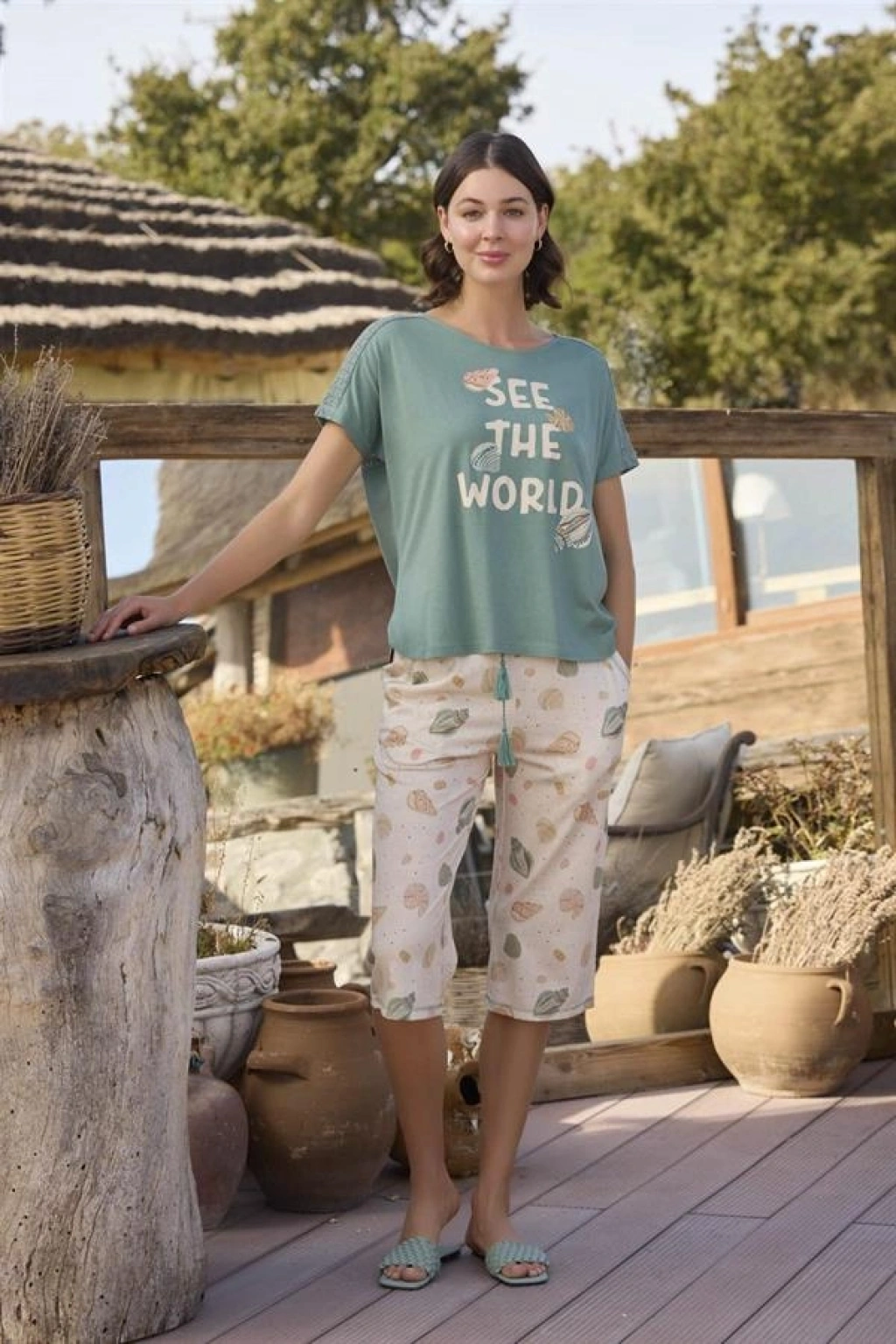 Üst: Yeşil renklidir, bisiklet yakalıdır, kısa kolludur, baskılıdır, "See The World" yazılıdır, örme kumaştır.