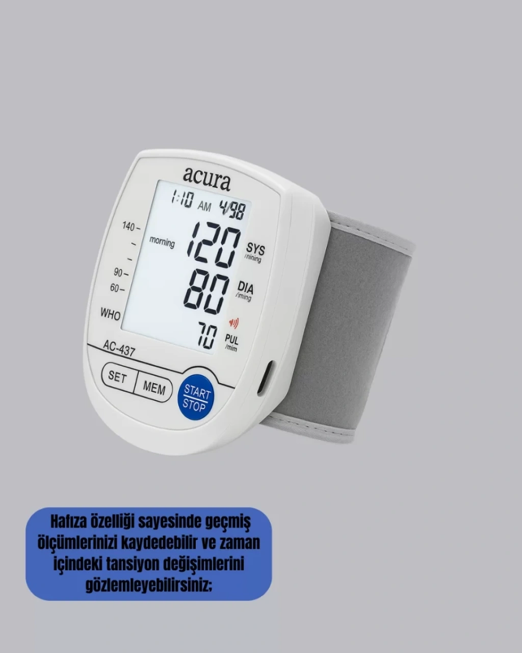 Bu dijital bilek tansiyon aleti, hem şarjlı hem pilli çalışma özelliği ile her koşulda en pratik tansiyon ölçümünü sunar. Özellikle yoğun tempoda yaşayanlar için hızlı ölçüm özelliği büyük kolaylık sağlar. Bileğe takıp tek tuşa basmanız yeterlidir; cihaz birkaç saniye içinde tansiyon ve nabız değerlerinizi net bir şekilde ekranda gösterir. Büyük dijital ekran, ölçüm sonuçlarını daha okunabilir hâle getirir. Cihazın hafıza özelliği, geçmiş ölçümlerinizi kaydederek tansiyon seyrini takip etmenize olanak tanır. Bu özellik, özellikle düzenli tansiyon kontrolü yapan kullanıcılar için oldukça değerlidir. Pilli kullanım özgürlük sunarken, şarjlı mod uzun süreli kullanımlarda pratiklik sağlar. Kompakt tasarımı sayesinde çantanızda rahatlıkla taşıyabilir, seyahatlerde yanınızdan ayırmadan kullanabilirsiniz. Kablo gerektirmemesi, kullanım alanınızı tamamen özgürleştirir. Hem pratik hem güvenilir bir tansiyon takip cihazı arayanlar için idealdir.