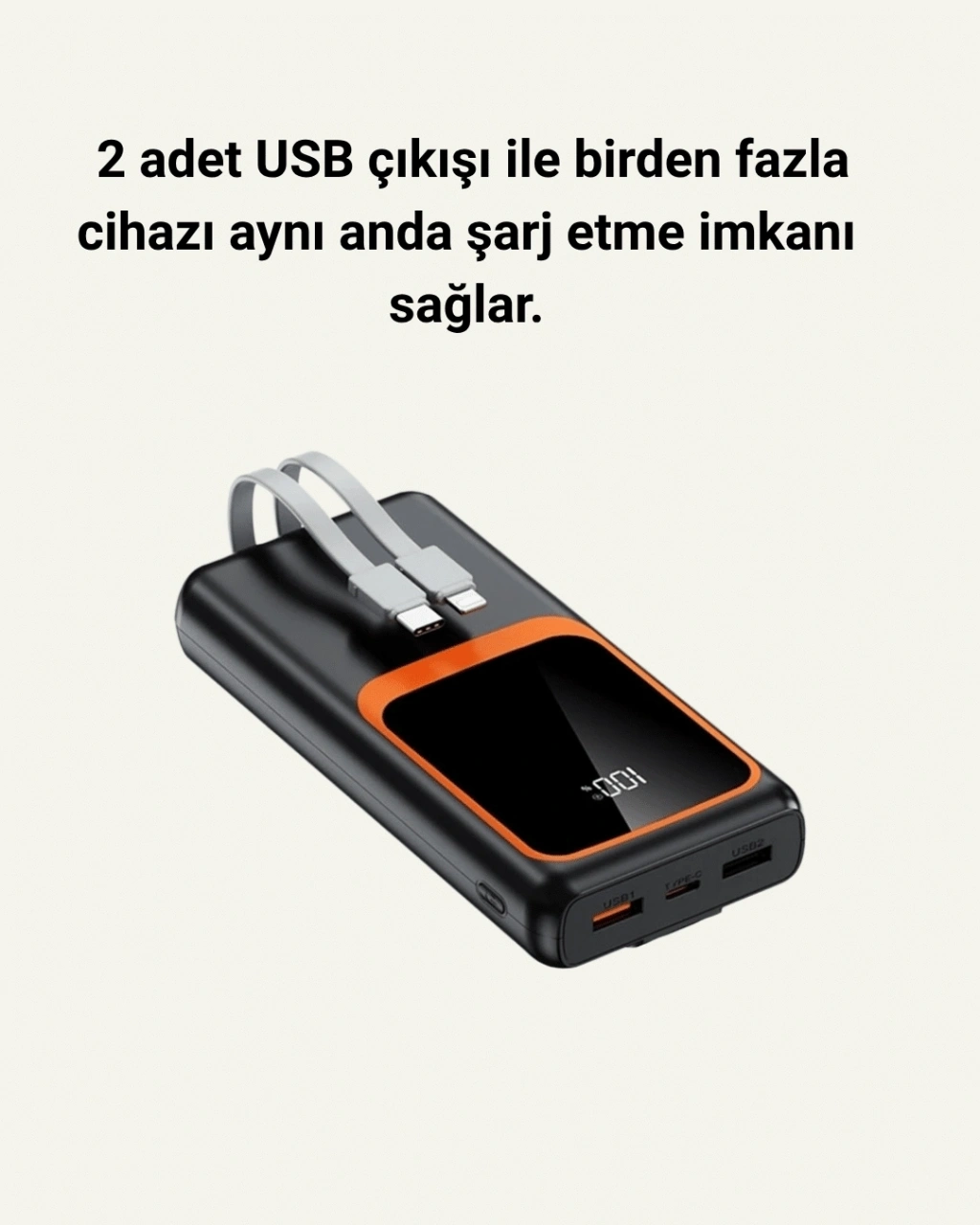 Üzerindeki LED dijital ekran sayesinde kalan pil yüzdesini net olarak takip edebilirsiniz. Ayrıca dahili çoklu kablolar (Type-C, Lightning, Micro USB) sayesinde tüm cihazlarla uyumlu çalışır. Kablo taşıma derdi olmadan kolay kullanım sağlar.