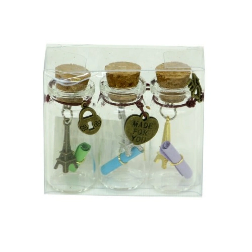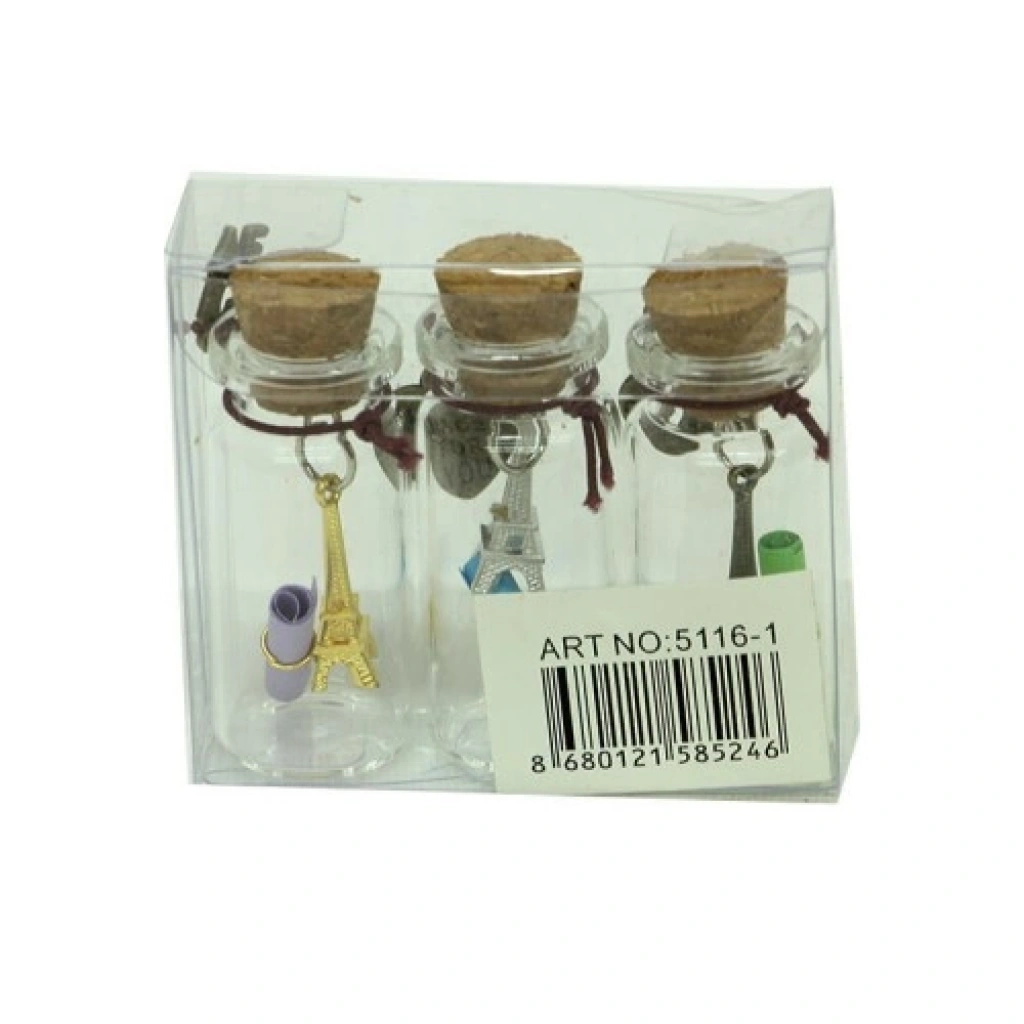 Dilek Şişesi modelidir. Tamamı cam malzemedenüretilmiştir. 1 pakette 3 adet mevcuttur. ÜrünEbatları Çap: 2 cm Yükseklik: 5,3 cm Paket İçeriği 1 Adet Dilek Şişesi