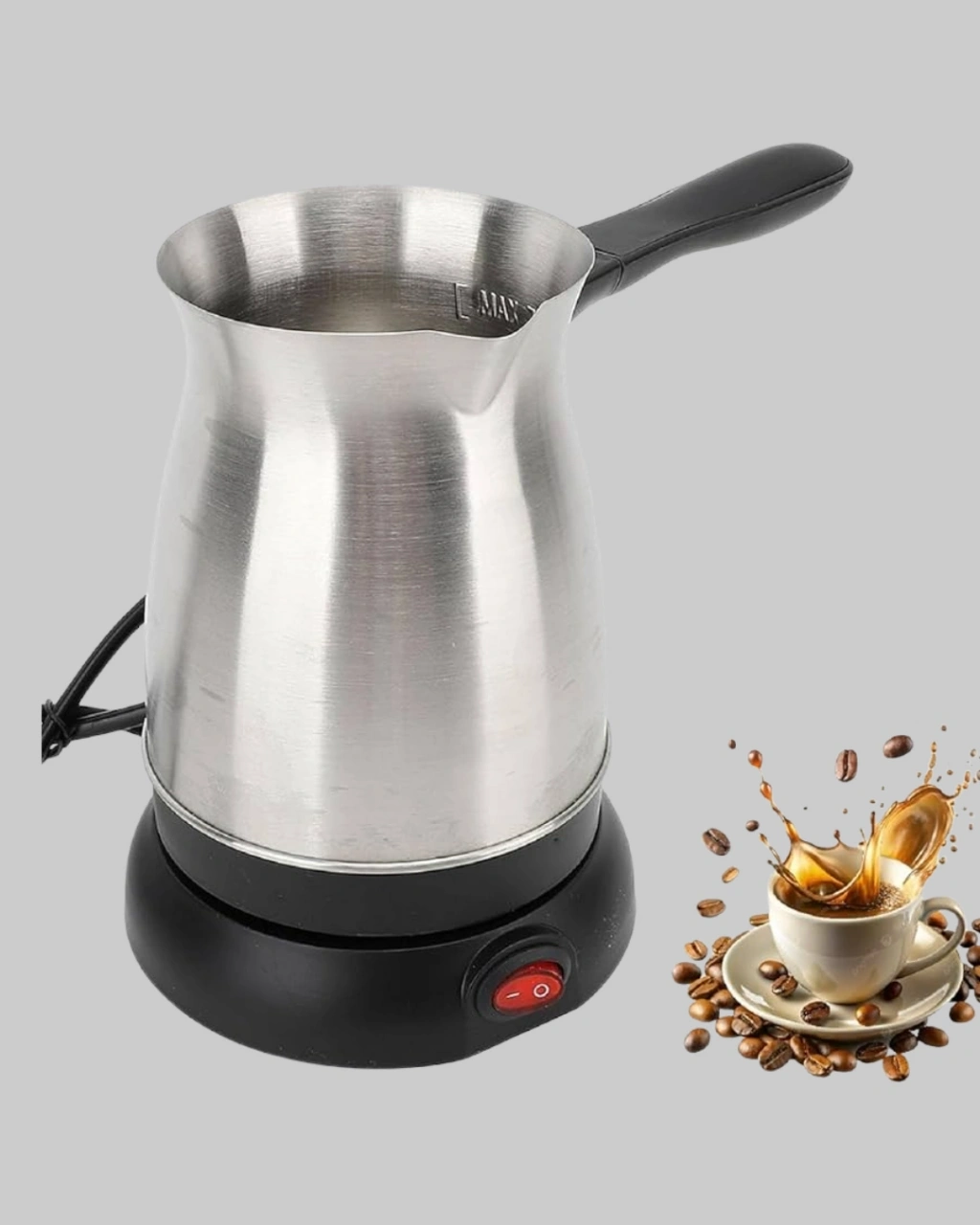 Geleneksel lezzeti modern teknolojiyle buluşturan elektrikli Türk kahvesi cezvesi, her fincanda mükemmel sonuçlar sunar.800W gücü ile kahvenizi kısa sürede hazırlar, 300 ml kapasitesiyle 6 fincana kadar servis yapmanıza imkan tanır.360° dönebilen kablosuz taban, cezveyi dilediğiniz yönden kaldırıp kullanmanızı kolaylaştırır.Gizli rezistans teknolojisi, hijyenik ve güvenli kullanım sunarken iç yüzeyin temizliğini basitleştirir.Paslanmaz çelik gövde, dayanıklılığı ve zarif görünümüyle öne çıkar.Isınmayan ergonomik kulp, konforlu bir tutuş sağlar.Kırmızı güç düğmesi sayesinde cezveyi kolayca açıp kapatabilirsiniz.Güçlü performansı, şık tasarımı ve uzun ömürlü yapısıyla bu cezve, mutfakta vazgeçilmeziniz olacak.Kahve tutkunları için hem estetik hem de işlevsel bir çözümdür.
