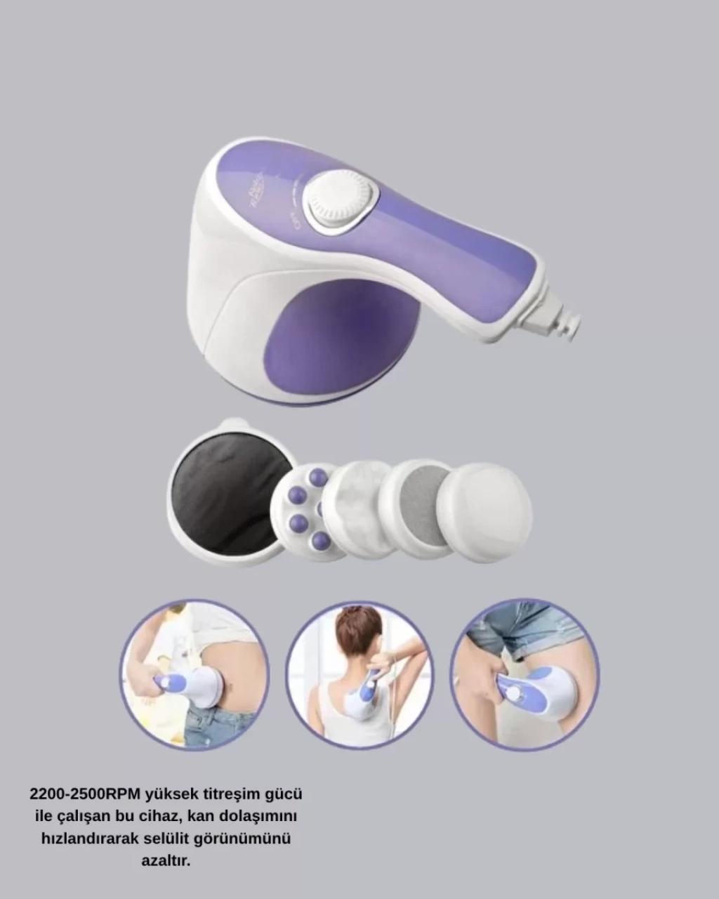 Daha sıkı ve formda bir görünüm hedefleyenler için tasarlanan bu elektrikli masaj aleti, 2200–2500 RPM aralığındaki güçlü titreşim performansı ile çalışır. Yüksek frekanslı titreşimler sayesinde kan dolaşımının desteklenmesine yardımcı olur, cilt yüzeyini uyarır ve düzenli kullanımda daha toparlanmış bir görünüm elde edilmesini destekler. Aynı zamanda selülit görünümünün azalmasına katkı sağlar.Cihaz, 5 farklı değiştirilebilir başlık ile birlikte gelir. Karın, bacak, kalça, kol ve sırt gibi farklı bölgelerde hedef odaklı kullanım imkânı sunar. Her başlık farklı masaj etkisi oluşturarak hem yüzeysel hem derin dokulara etki eder. Bu sayede kasların gevşemesine yardımcı olurken cilt dokusunun canlanmasını destekler.Ayarlanabilir hız seçenekleri, kullanım yoğunluğunu kişisel ihtiyaca göre belirlemenizi sağlar. Ergonomik tasarımı sayesinde ele rahat oturur ve uzun süreli uygulamalarda konfor sunar. Hafif yapısı, pratik kullanım avantajı sağlar.Ev ortamında profesyonel bakım hissi sunan bu cihaz, hem kas gevşetme hem de yağ yakım sürecini destekleme amacıyla kullanılabilir. Sessiz çalışma özelliği ve düşük enerji tüketimi sayesinde günlük kullanıma uygundur. Düzenli uygulama ile daha sıkı, pürüzsüz ve canlı bir cilt görünümü elde etmenize yardımcı olur.