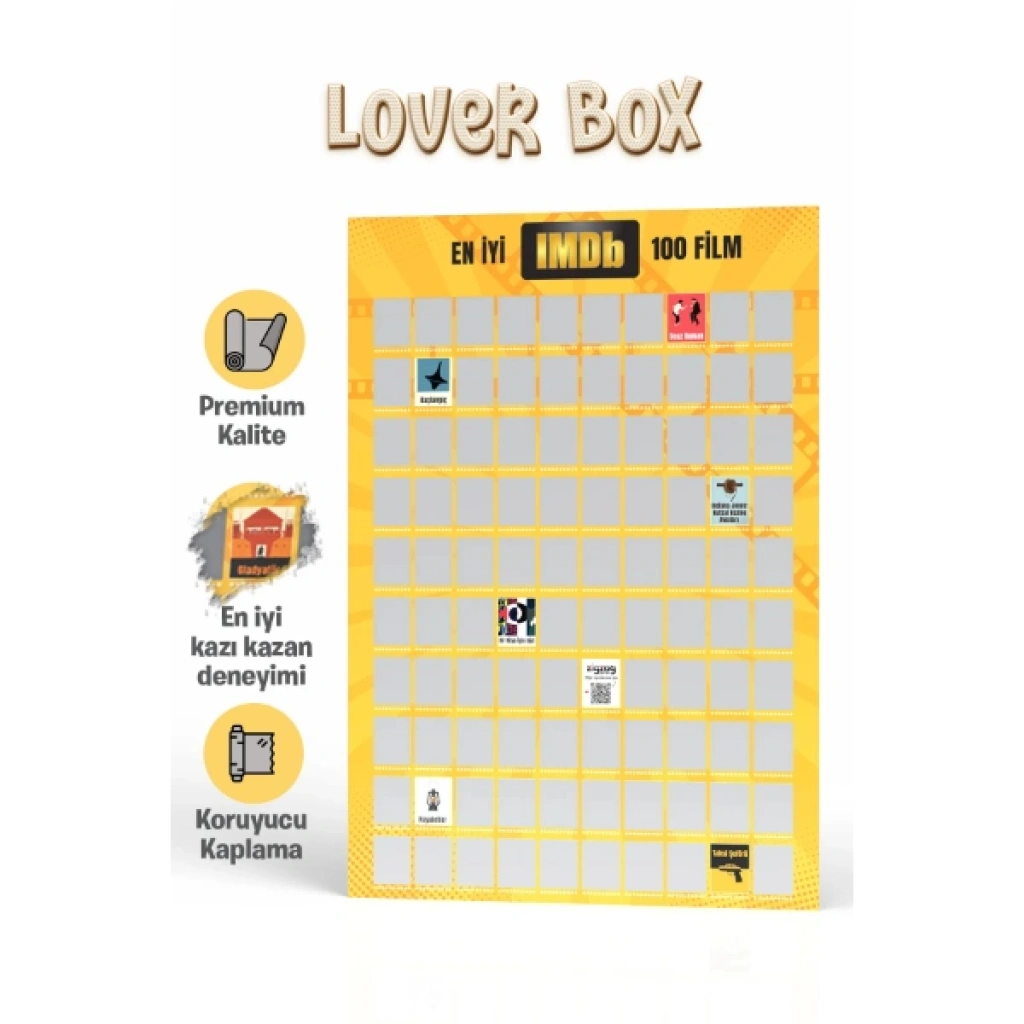 En İyi IMDb 100 Film Kazı Kazan Posteri, sinema tutkunları için özel olarak tasarlanmış, interaktif bir kültürel rehberdir. Sinema tarihine damga vurmuş, eleştirmenlerden tam not almış ve IMDb listelerinin zirvesinde yer alan en iyi 100 filmi tek bir tabloda bir araya getiriyor. Premium kalitede kuşe kağıt üzerine uygulanan özel koruyucu kaplama, uzun ömürlü bir kullanım sunarken; gümüş kazınabilir katman her filmden sonra pürüzsüz bir kazıma deneyimi vaat eder. İzlediğiniz her başyapıtın ardından ilgili kareyi kazıyarak, o filme özel tasarlanmış renkli ve ikonik görseli ortaya çıkarabilirsiniz. "En İyiler Senin Duvarında" sloganıyla sunulan bu interaktif poster, sadece bir izleme listesi değil, aynı zamanda eviniz veya ofisiniz için modern bir dekoratif tablo niteliğindedir. Sinema bilginizi sınayacağınız, yeni başyapıtlar keşfedeceğiniz ve film izleme deneyiminizi bir koleksiyon oyununa dönüştüreceğiniz bu ürün, film severler için eşsiz bir motivasyon kaynağıdır. Şık silindir kutusuyla gönderilen bu poster, sevdikleriniz için prestijli ve unutulmaz bir hediyelik eşya seçeneği olarak öne çıkar. Ürün Teknik Özellikleri ÖzellikAçıklama Ürün AdıEn İyi IMDb 100 Film - Kazı Kazan Posteri İçerikIMDb Listesinin En İyi 100 Başyapıtı MateryalPremium Kalite Mat Kuşe Kağıt KaplamaKoruyucu Özel Kaplama ve Gümüş Kazınabilir Yüzey TasarımLover Box Serisi, İkonik Film Görselleri Fonksiyonİnteraktif İzleme Listesi ve Dekoratif Tablo Hediye KonseptiSinema Severler, Yeni Ev Hediyesi, Kültür Sanat Tutkunları Paket İçeriği1 Adet En İyi IMDb 100 Film Kazı Kazan Posteri (Özel Koruyucu Silindir Kutuda)