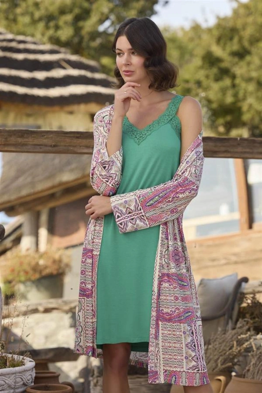 Gecelik: Yeşil renklidir, derin V yakalıdır, dekoltelidir, dantel askılıdır, yakası, kol altı ve sırt kısmı ile askısı dantellidir, örme kumaştır.