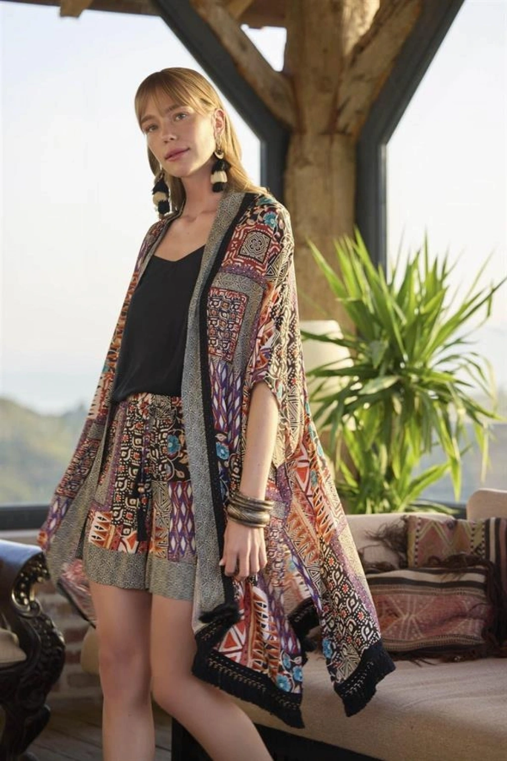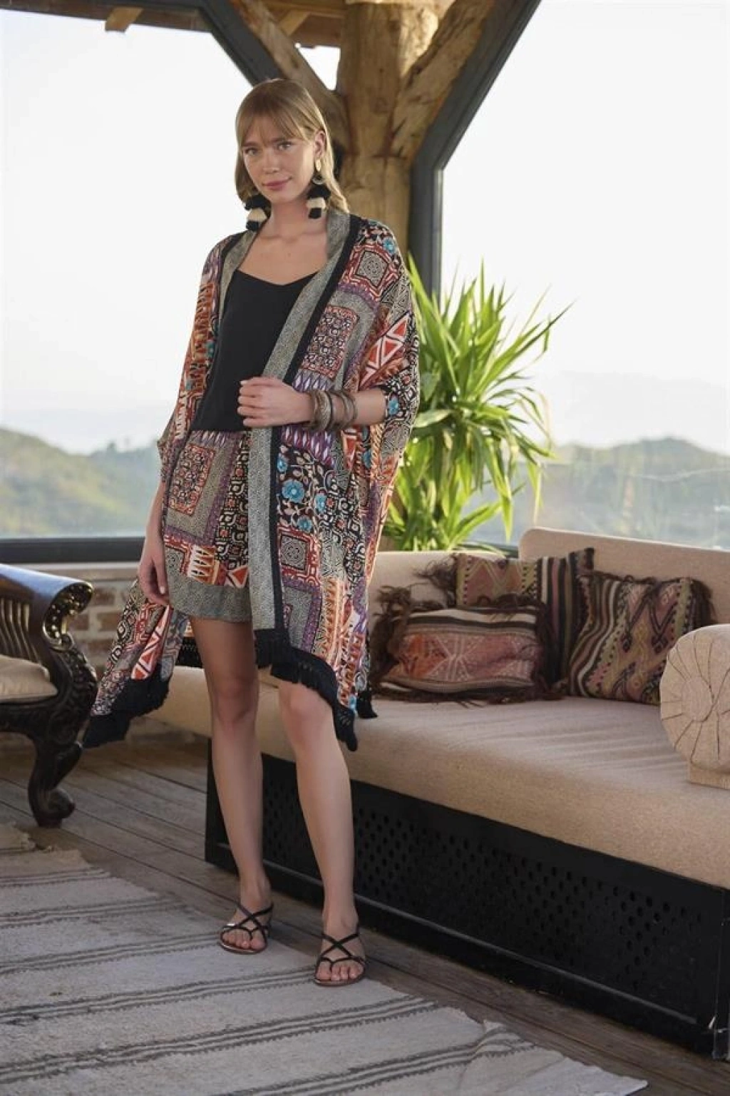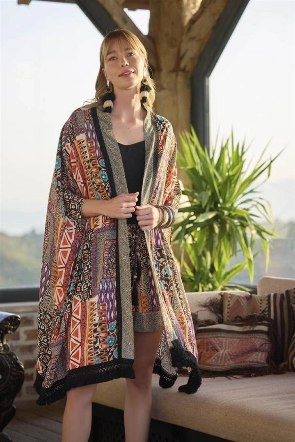Kimono: Etnik desenlidir, 3/4 kolludur, etek ucu püskül detaylıdır, dokuma kumaştır.
