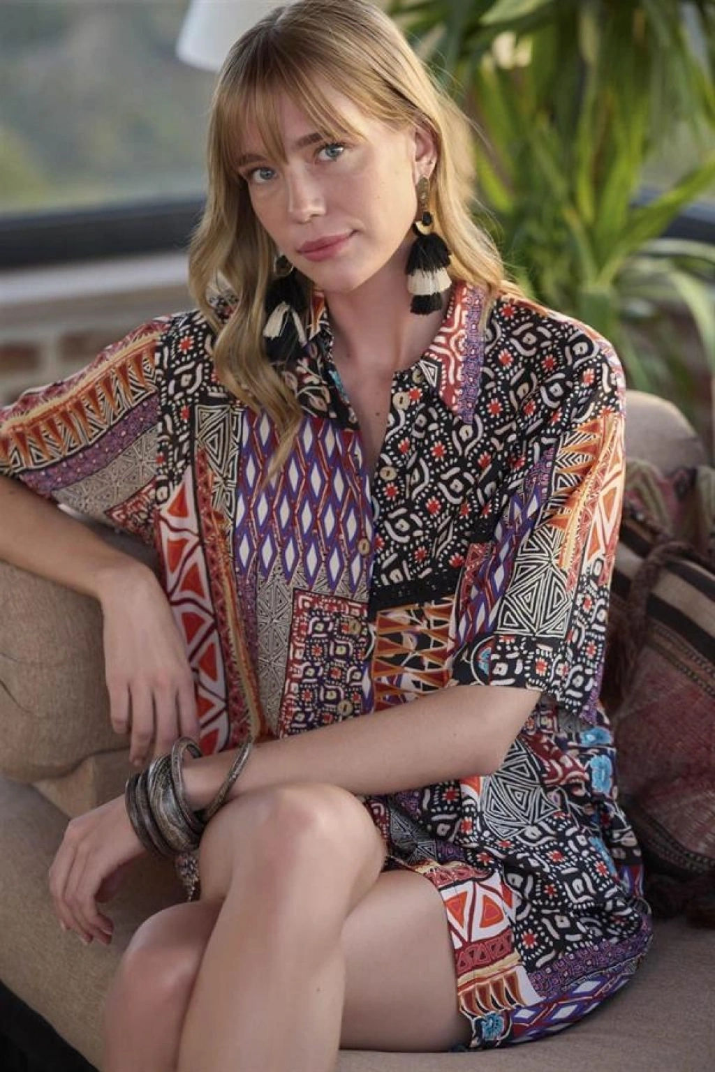 Üst: Etnik desenlidir, gömlek yakalıdır, kısa kolludur, önü düğmelidir, dokuma kumaştır.