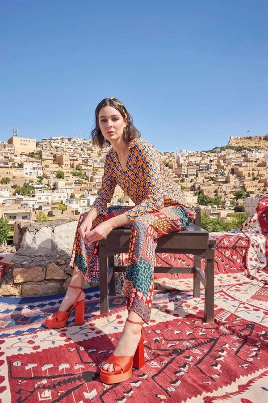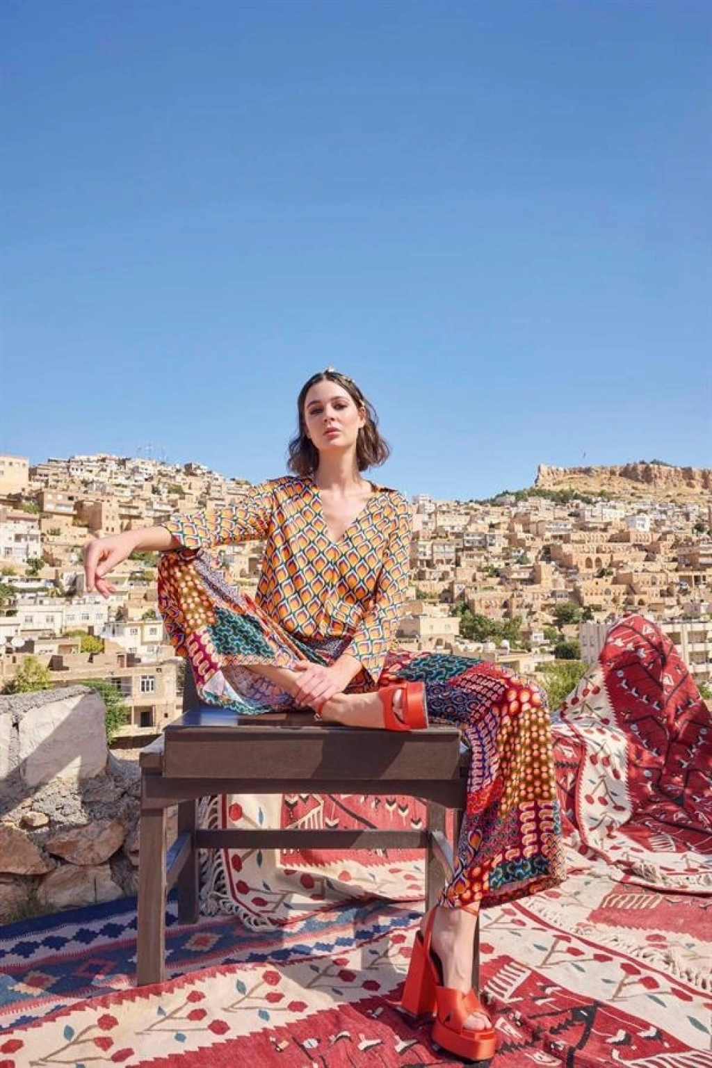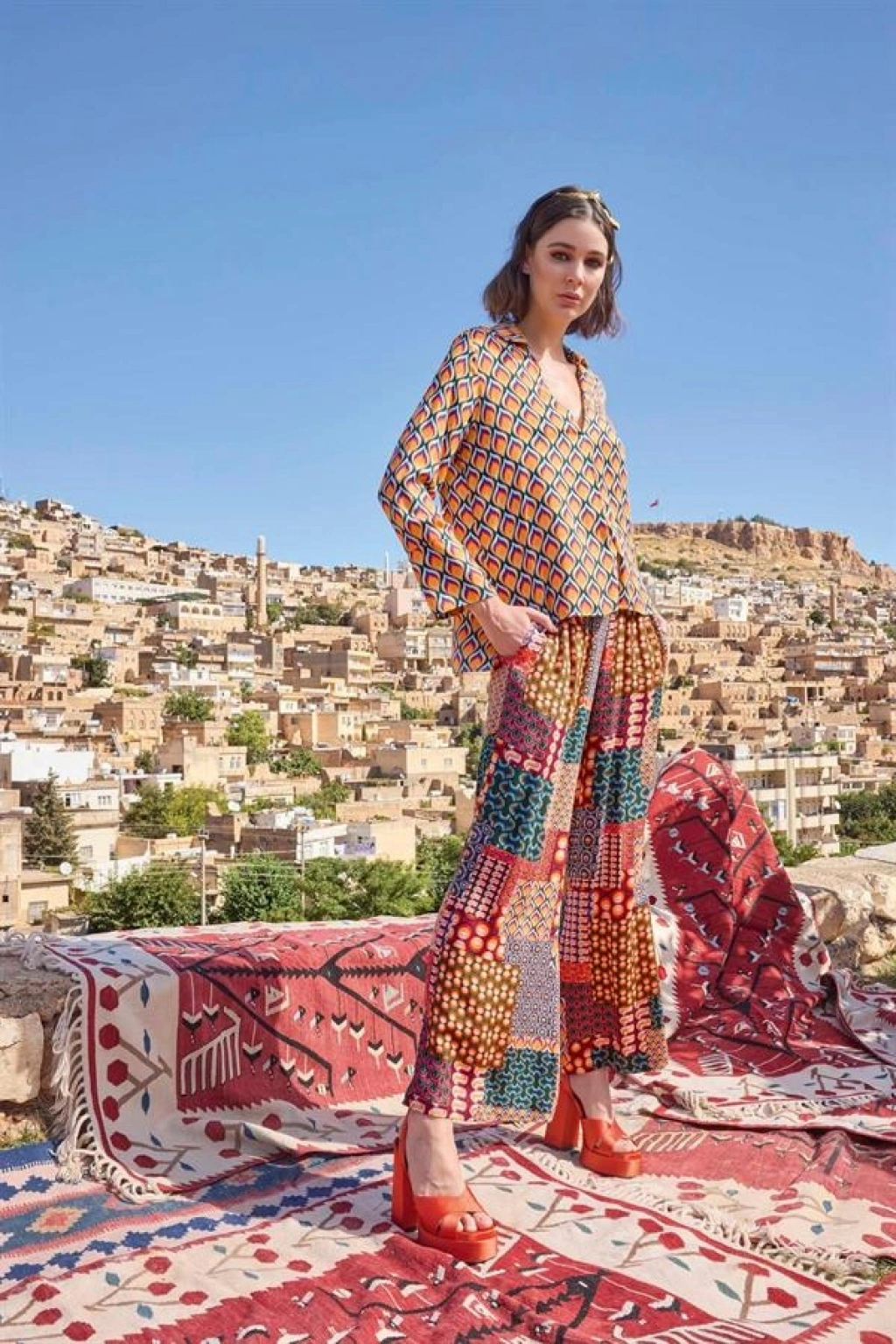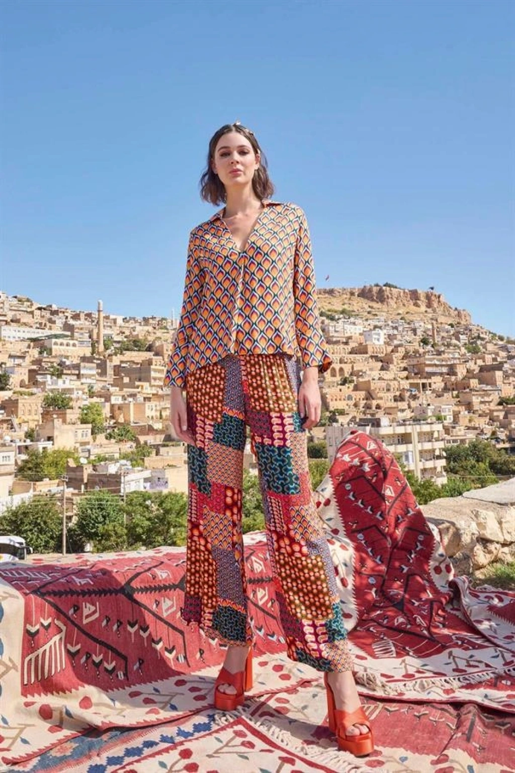 Üst: Etnik desenlidir, gömlek yakalıdır, uzun kolludur, dokuma kumaştır.