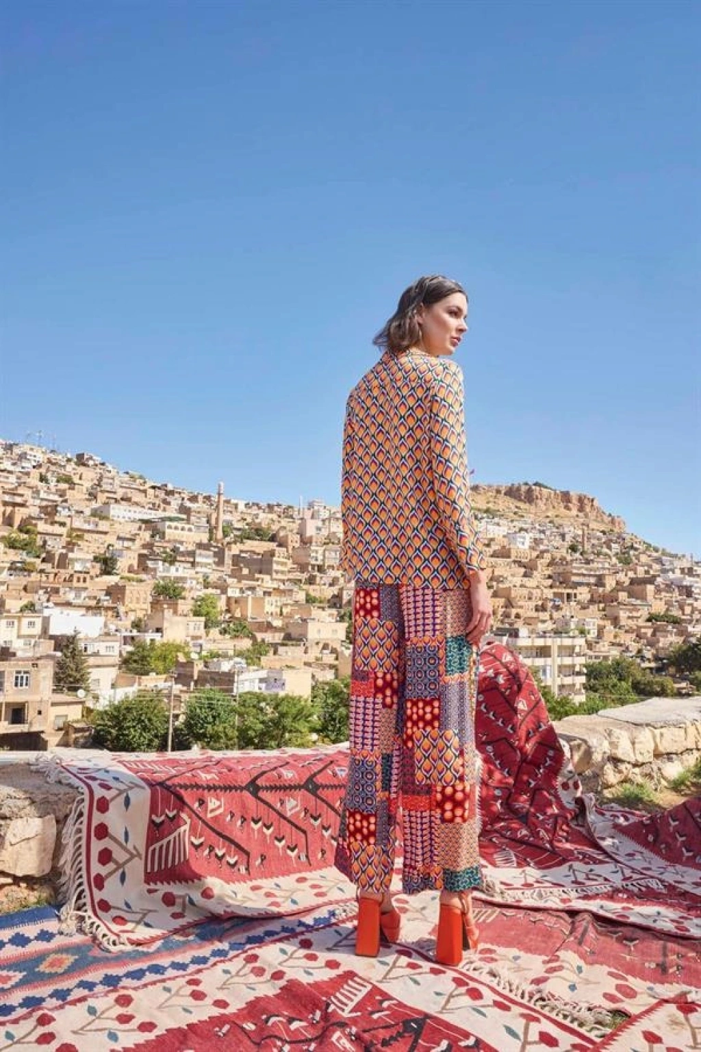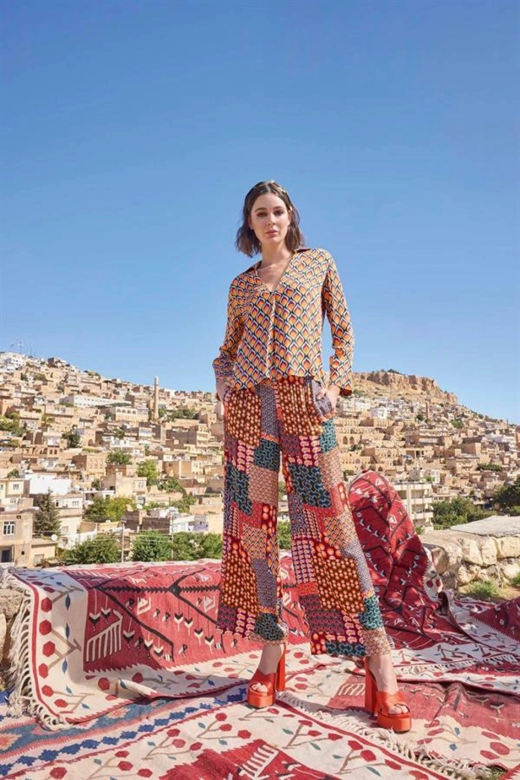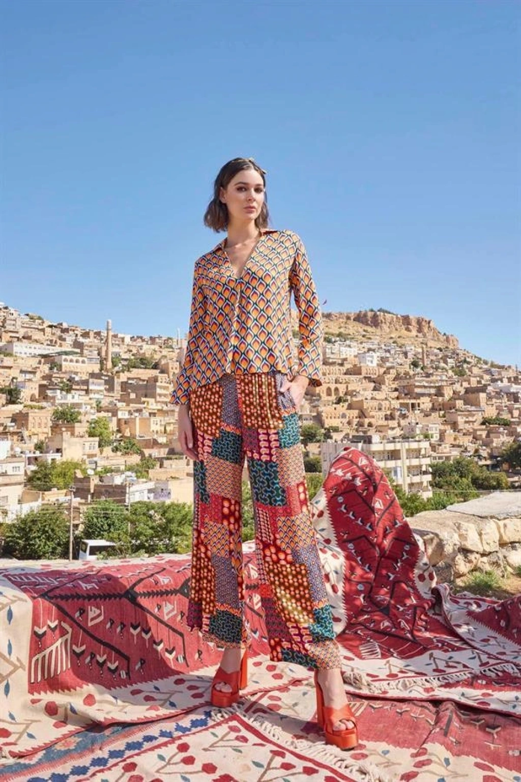 Üst: Etnik desenlidir, gömlek yakalıdır, uzun kolludur, dokuma kumaştır.