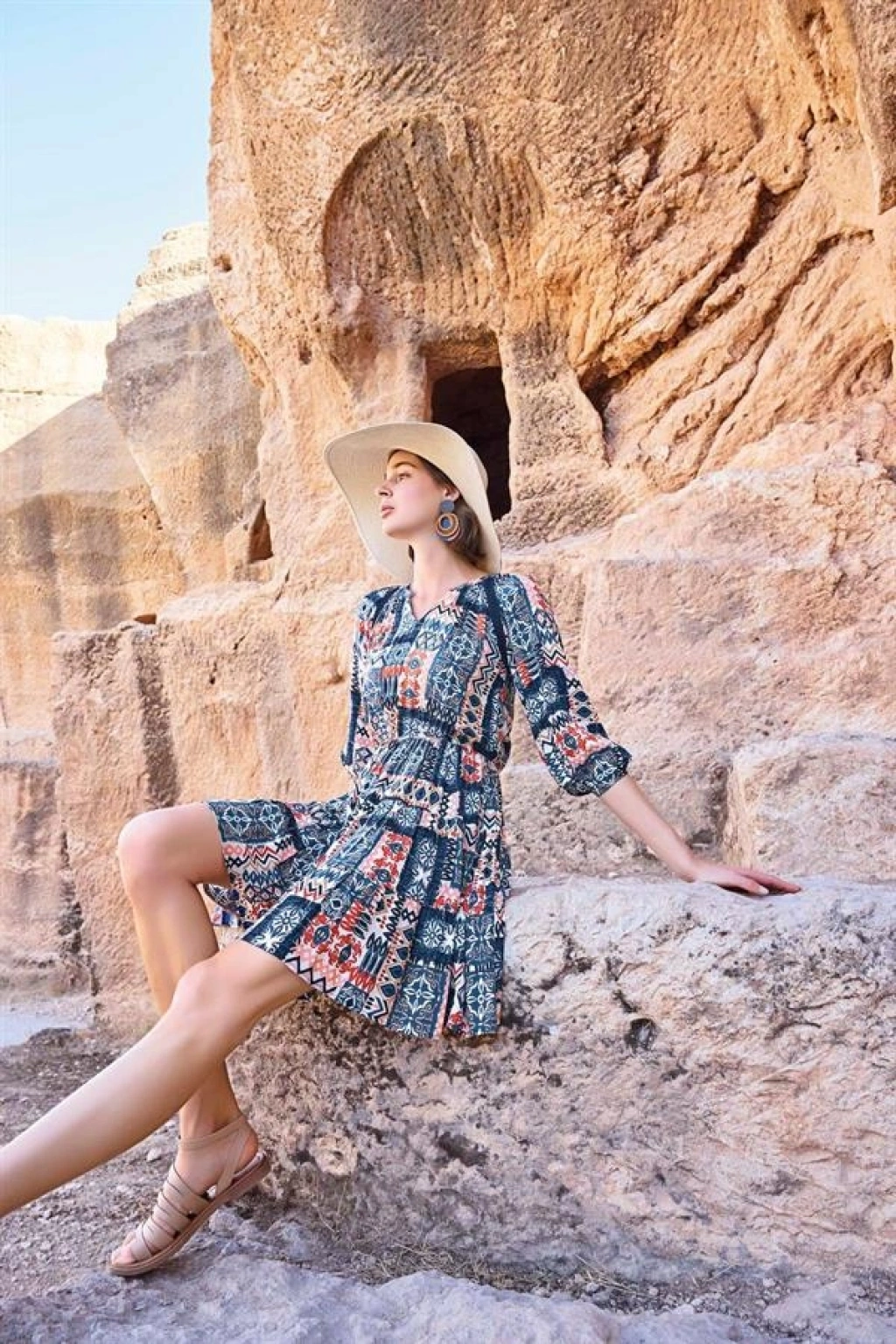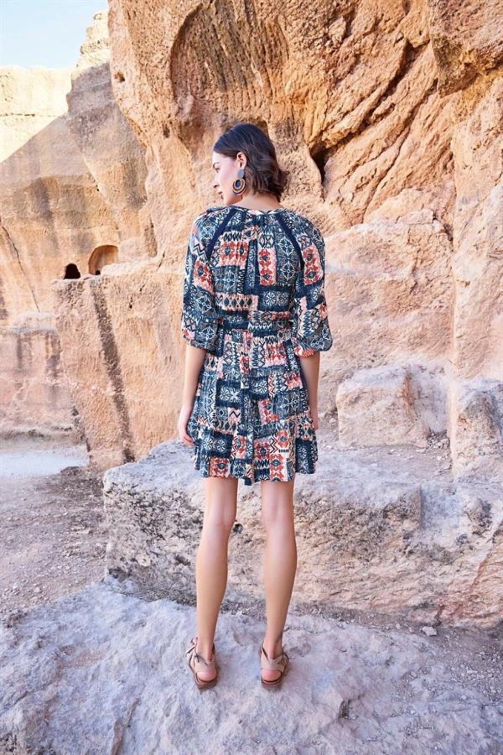 Elbise: Etnik desenlidir, V yakalıdır, truvakar kolludur, dokuma kumaştır.