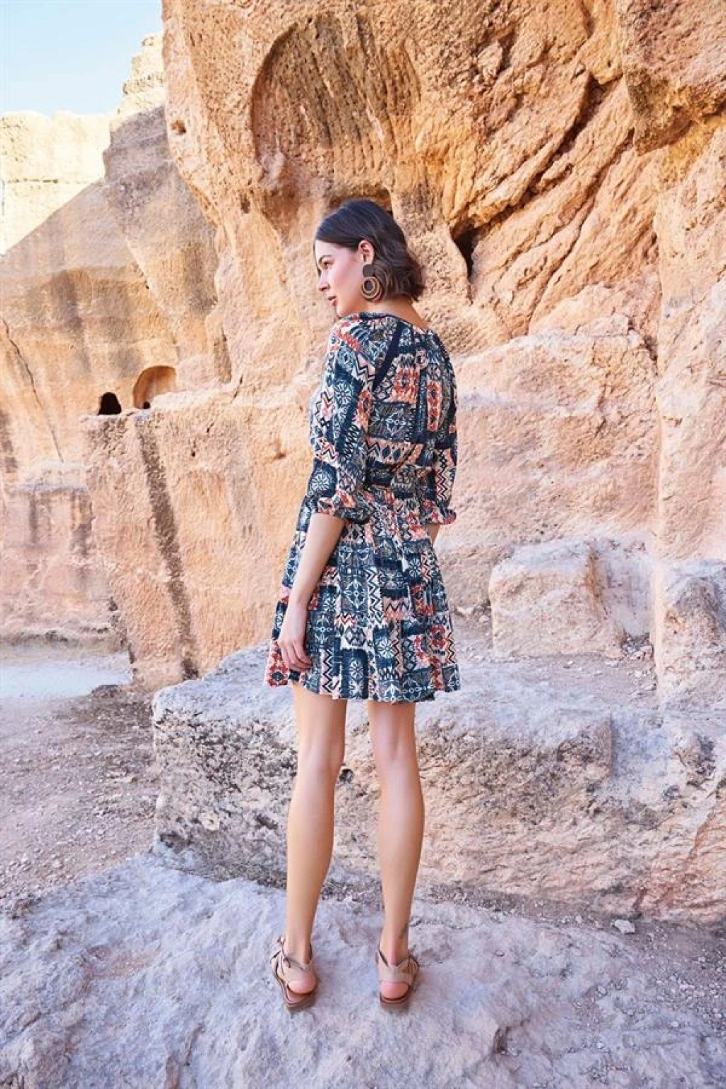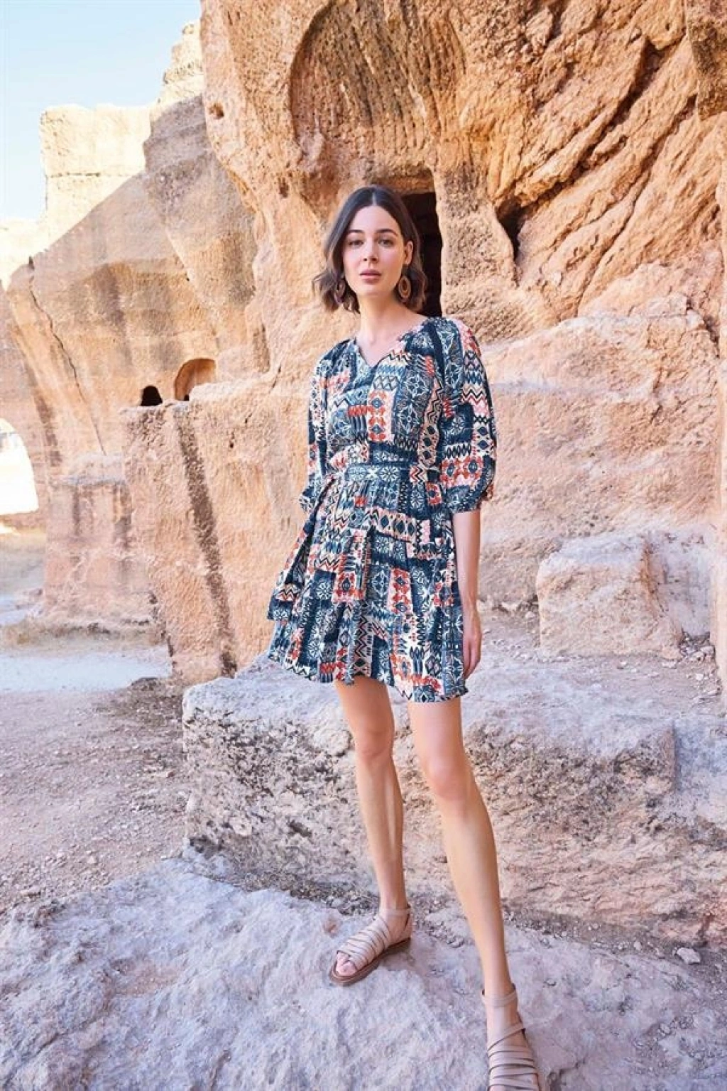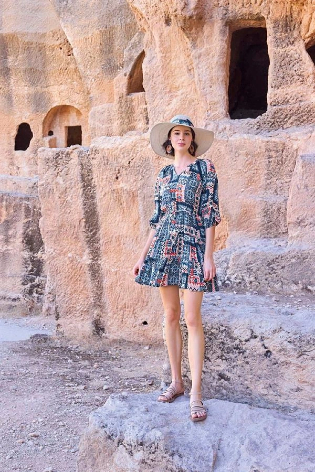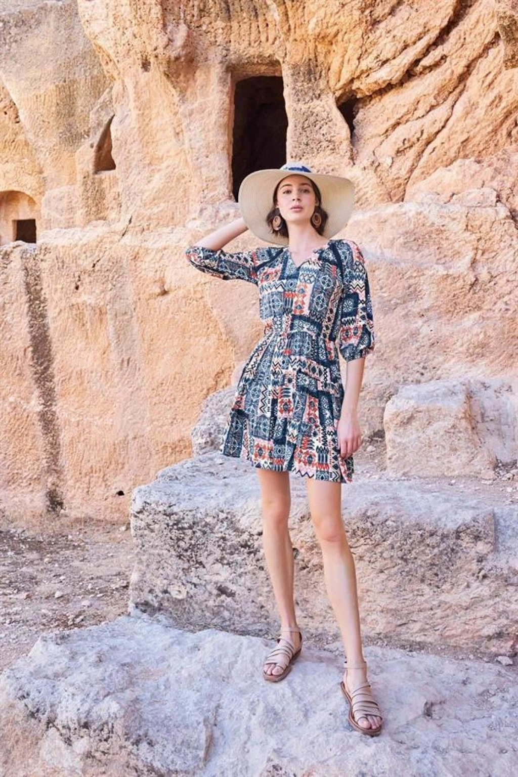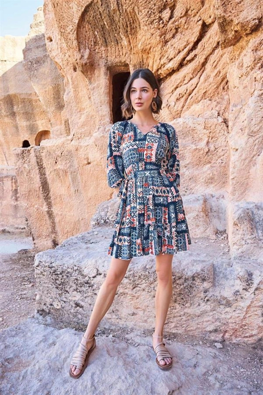 Elbise: Etnik desenlidir, V yakalıdır, truvakar kolludur, dokuma kumaştır.