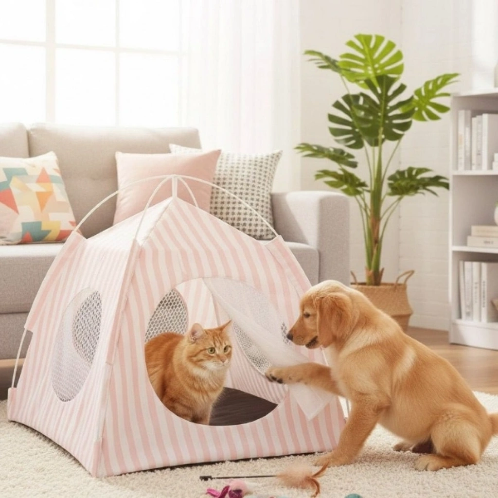 Evcil Hayvan Katlanabilir Oyun Çadırı, kediler ve küçük ırk köpekler için güvenli ve eğlenceli bir yaşam alanı sunar. 41x41 cm taban ölçüsü ve 43 cm yüksekliği ile evcil hayvanların rahatça içine girip uzanabileceği bir alan oluşturur. Hafif ve katlanabilir yapısı sayesinde hem ev içinde hem de dış mekânda kolayca kullanılabilir. Nefes alabilir file pencereleri hava sirkülasyonunu artırırken, ön kısmındaki perde detaylı giriş kapısı hayvanların özgürce girip çıkmasını sağlar. Dayanıklı kumaşı uzun süreli kullanım sağlar ve pratik kurulumu ile her ortamda hızlıca hazırlanabilir. Renk seçimi yapılamaz; görselde yer alan renklerden biri karışık olarak gönderilir. Paket İçeriği1 adet Katlanabilir Evcil Hayvan Oyun Çadırı