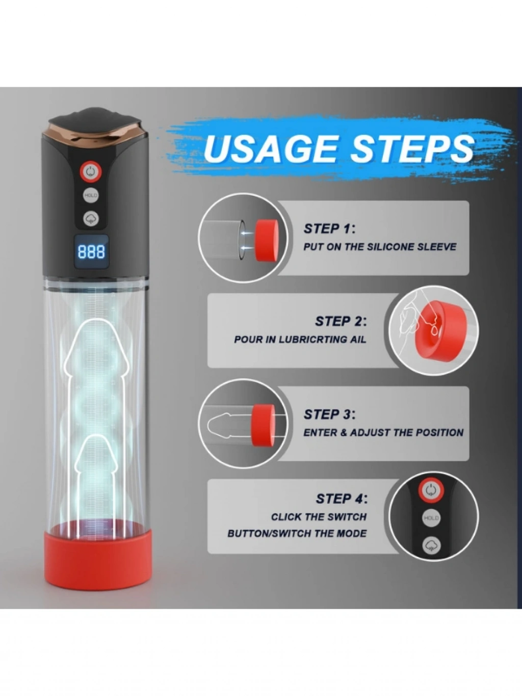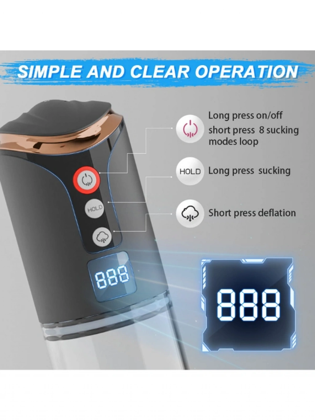 LCD ekranlı, yeni yükseltilmiş otomatik penil pompası, daha dayanıklı malzemeden üretilmiş vakum tüpü ve hava geçirmezliği artırılmış silikon kılıf ile geliştirilmiştir. Ayrıca, farklı uyarım seviyeleri sunmak için 6 farklı boyutta penil halkasıyla birlikte gelir. Tüm bu iyileştirmeler, penilinizin daha büyük, daha güçlü ve daha uzun süreli ereksiyonlara ulaşmasına yardımcı olmak için tasarlanmıştır. Penis pompası, negatif basınç yoluyla kan damarlarını genişleterek kan akışını artırır; bu sayede penil zamanla uzar ve sertleşir. Sonuç olarak, daha sıkı ve enerjik bir penil elde edilir. Bu süreç, psikolojik durumunuzu ve özgüveninizi de olumlu yönde etkileyebilir. LCD ekranlı güçlü emiş sistemi sayesinde kullanımı oldukça kolaydır. Kontrol ünitesinde üç düğme ile 8 farklı emiş modu ve sayaç modu bulunur. Dilediğiniz basınç seviyesini özgürce ayarlayabilirsiniz. Yeni başlayanların aşamalı bir şekilde kullanıma geçmeleri önerilir. Emniyet için, basıncı istediğiniz zaman serbest bırakabileceğiniz bir tahliye düğmesi de mevcuttur. Bu penil pompası, gizliliğinizi koruyan özel ve dikkat çekmeyen bir paket içerisinde sunulur. Paket içeriği: 1 adet penil pompası, 2 adet conta, 6 adet penil halkası, 1 adet manyetik şarj kablosu ve 1 adet kullanıcı kılavuzudur.