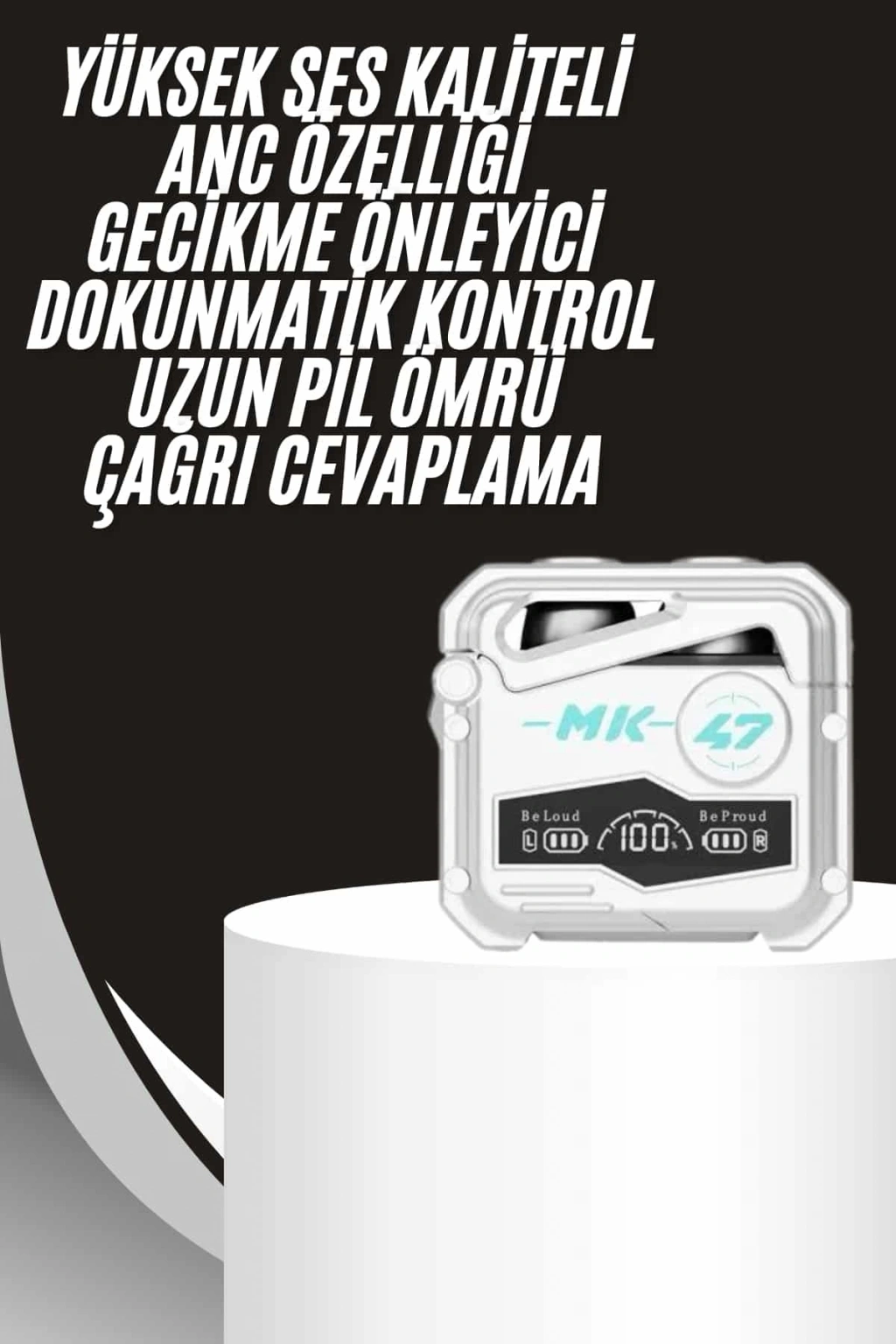 MK47 Bluetooth kulaklık, ister oyun oyna ister müzik dinle, her senaryoda yanınızda! Gelişmiş Bluetooth 5.0 teknolojisiyle donatılan bu kulaklık, anında bağlantı kurar ve düşük gecikme modu sayesinde sesin görüntüyle senkronunu kaybetmez.Performans Odaklı Tasarım13 mm dinamik sürücüler ile donatılmış MK47, net tizler ve derin baslarla sizi adeta sesin içine çeker. Ergonomik yapısı, kulağınıza tam oturur ve uzun süreli kullanımda bile rahatsızlık vermez.Oyun & Müzik Modu Tek Tuşla3 kez dokunarak modlar arasında geçiş yapabilir, ihtiyaç duyduğunuz performansı anında yakalayabilirsiniz. Oyunlarda rakiplerinizi önce duymanın farkını yaşayın!Uzun Süreli GüçHer kulaklık 4-5 saat kesintisiz kullanım sunarken, 400mAh kapasiteli şarj kutusu kulaklıkları 4 kez daha doldurabilir. Şarj derdi yok, kesintisiz keyif var!Su Sıçramalarına DayanıklıIPX5 sertifikası sayesinde yağmurlu havada ya da spor yaparken gönül rahatlığıyla kullanabilirsiniz.Öne Çıkan Özellikler: Hızlı eşleşme ve otomatik bağlantı Parmak izi dokunmatik kontrol Gürültü azaltıcı mikrofon Sesli asistan desteği Oyun modu için düşük gecikme Şık LED dijital ekran göstergesiTeknik Özellikler: Model: MK47 Bluetooth: 5.0 Şarj Kutusu Kapasitesi: 400mAh Kulaklık Kapasitesi: 40mAh Mikrofon Hassasiyeti: -38dB Su Geçirmezlik: IPX5 Şarj Arayüzü: Type-C Kapsama Alanı: 10 metre