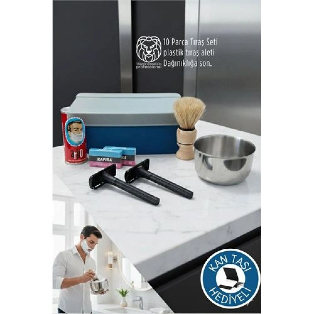 içindekileri : tıraş kutusu, tıraş fırçası ahşap saplı, tıraş sabunu, 20 adet yaprak jilet, tıraş tası 304 paslanmaz çelik, 2 adet tıraş aleti plastik , 40 adet kan durdurucu kantaşı