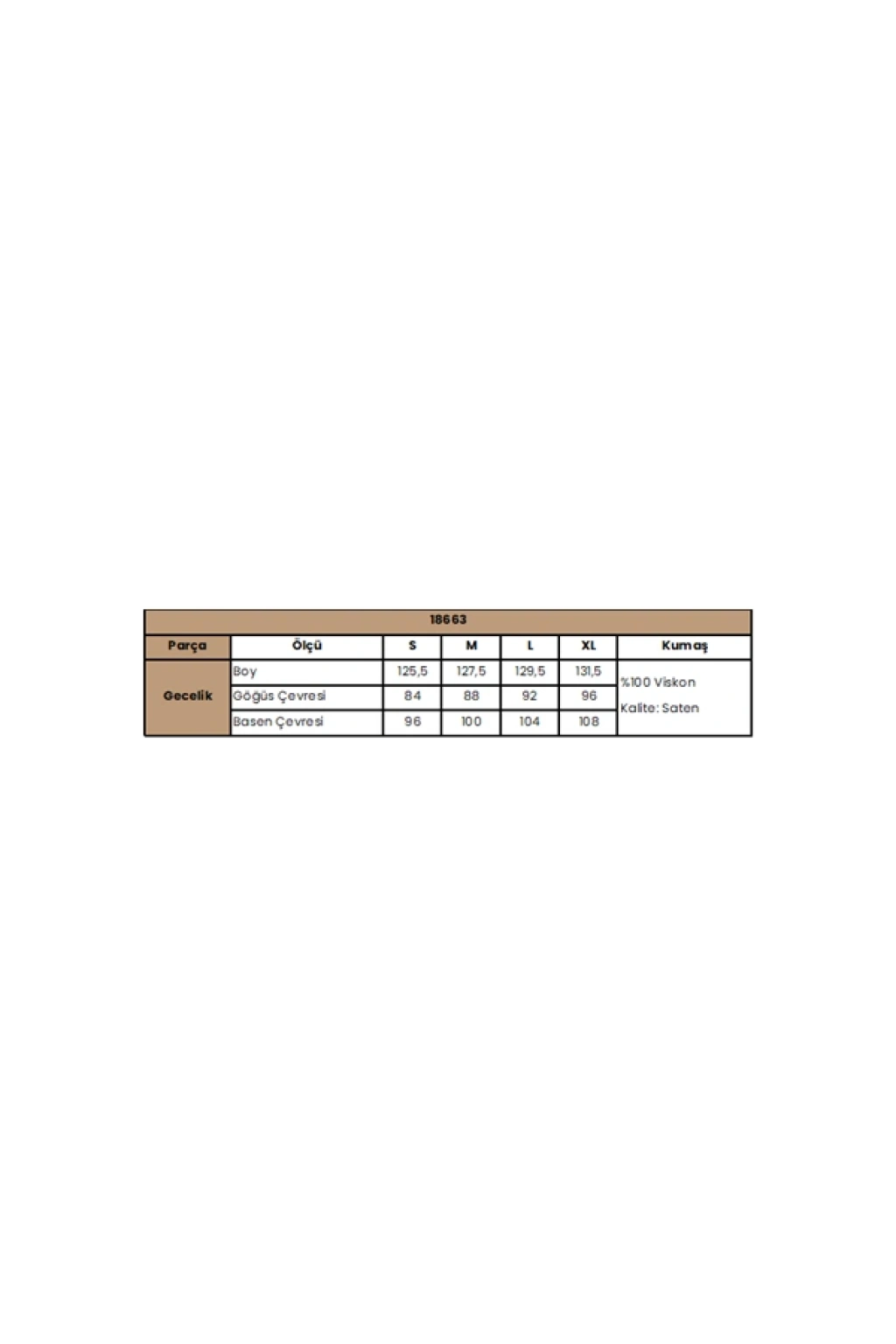 Gecelik: Beyaz renklidir, derin V Yakalıdır, göğüs ve sırt dekoltelidir, ip askılıdır, yakası, beli, göğüs altı ve askı kenarları dantellidir, yırtmaçlıdır, saten kumaştır.