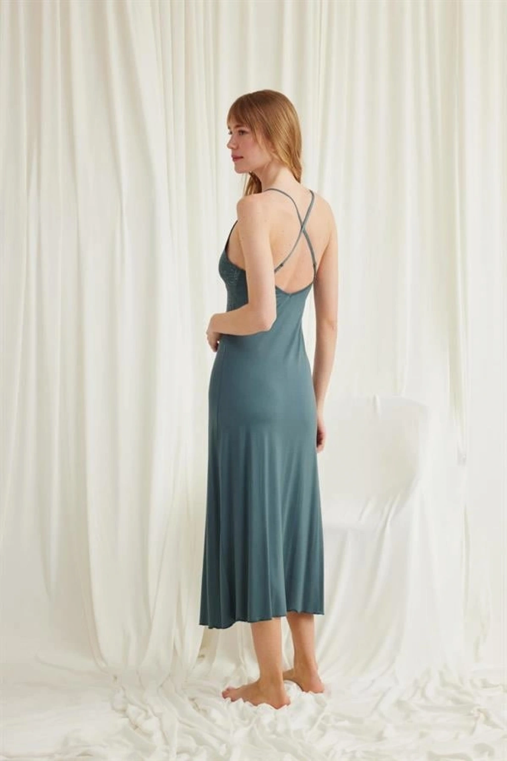 Gecelik: Yeşil renklidir, derin V yakalıdır, göğüs ve sırt dekoltelidir, yakası, göğsü ve göğüs altı dantellidir, ayarlanabilir lastik askılıdır, yırtmaç detaylıdır, örme kumaştır.