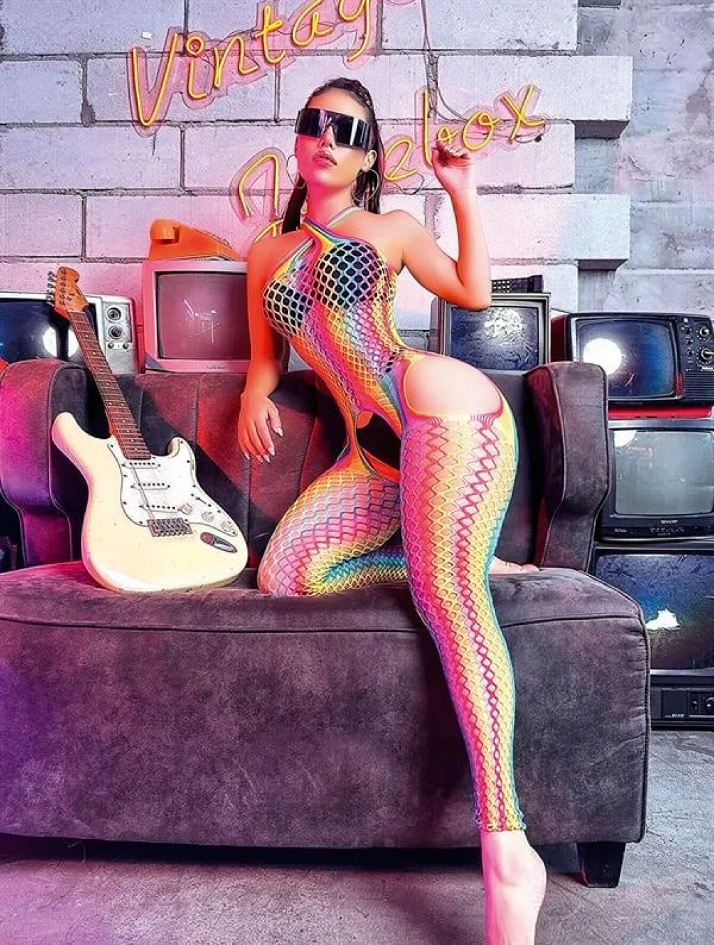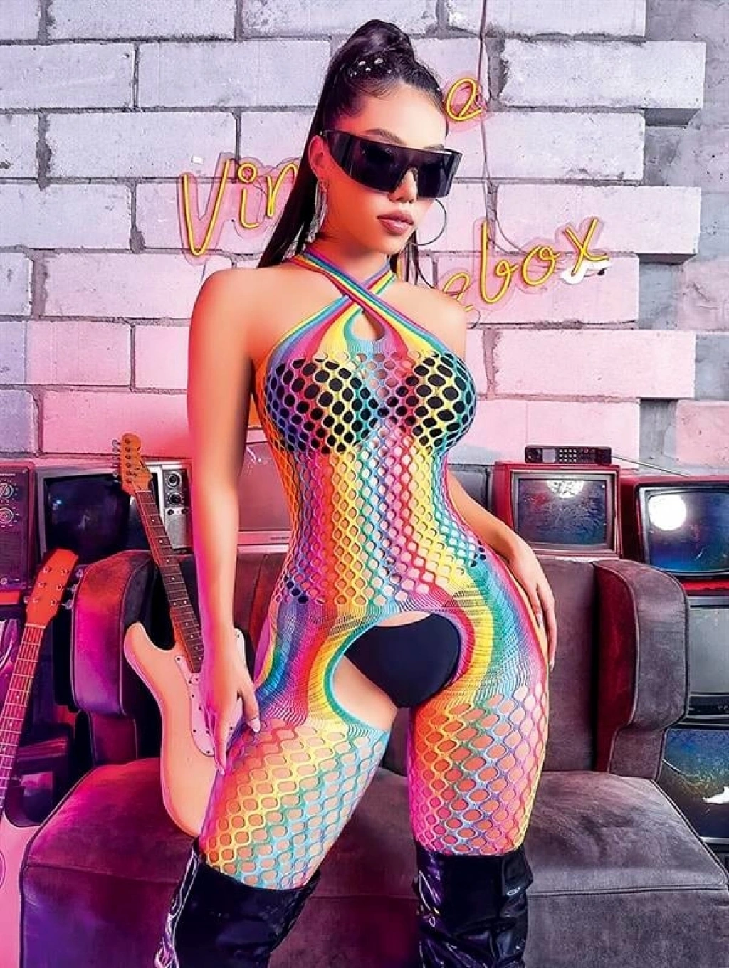 Renklerin enerjisiyle cesur bir stil! Gökkuşağı desenli file tasarımıyla öne çıkan bu fantezi vücut çorabı, feminen hatları ön plana çıkarırken eğlenceli ve baştan çıkarıcı bir görünüm sunar.
