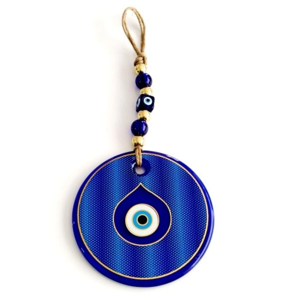 Gold Yaldızlı ürünümüz damla model göz ile süslenmiştir. Ürünümüz birinci kalite cam malzemeden üretilmektedir. Ürünümüzün yuvarlak kısmı 13 santimetre çapındadır. Ürünümüz ip dahil 30 santimetre boyundadır.