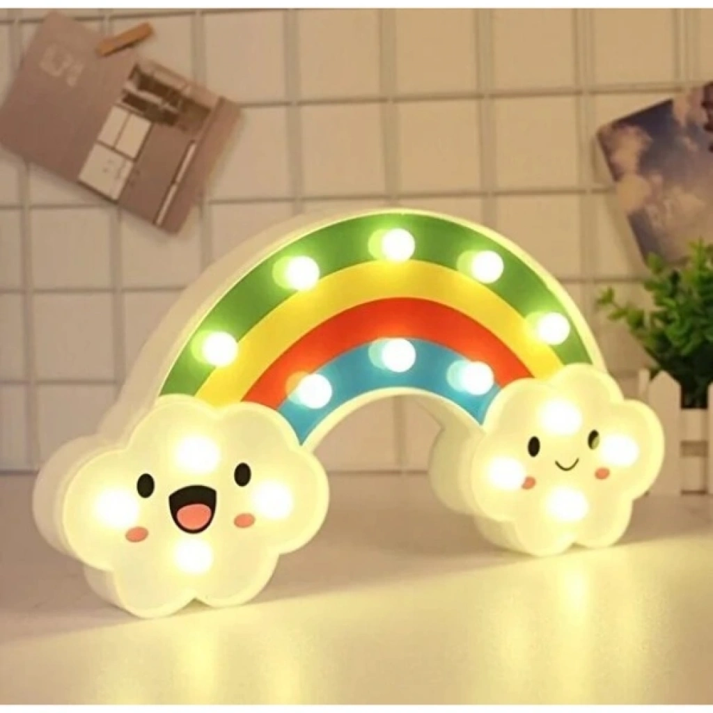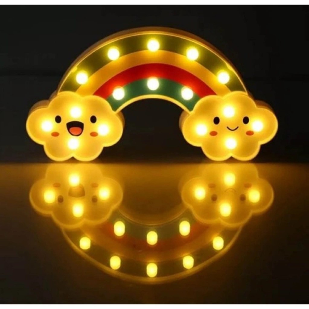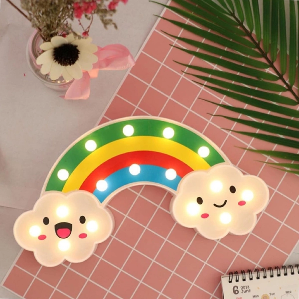 Gülen Bulutlu Gökkuşağı LED Gece Lambası, çocuk odalarına neşe ve huzur katmak için tasarlanmış dekoratif ve işlevsel bir aydınlatmadır. 30x16 cm boyutundaki bu şirin gece lambası, gökkuşağı formu ve gülen bulut figürleriyle hem sevimli bir aksesuar hem de yumuşak ışığıyla rahatlatıcı bir gece arkadaşıdır.Arkasında bulunan asma yerleri sayesinde dilerseniz duvara monte edebilir, dilerseniz masa üstünde kullanabilirsiniz. Kalem pil ile çalışır ve piller pakete dahil değildir. Gün ışığı rengindeki yumuşak LED ışıkları göz yormaz, loş bir ambiyans oluşturarak çocukların daha huzurlu uyumasına yardımcı olur. Ayrıca enerji tasarruflu yapısıyla uzun süreli kullanım sağlar.Hem çocukların odasında dekoratif bir obje olarak hem de gece lambası ihtiyacını karşılayan bu ürün, şirin tasarımıyla eğlenceli ve güvenli bir ortam oluşturur. Sevdiklerinize hediye edebileceğiniz ideal bir seçenek olarak da öne çıkar. Paket İçeriği1 adet Gülen Bulutlu Gökkuşağı LED Gece Lambası