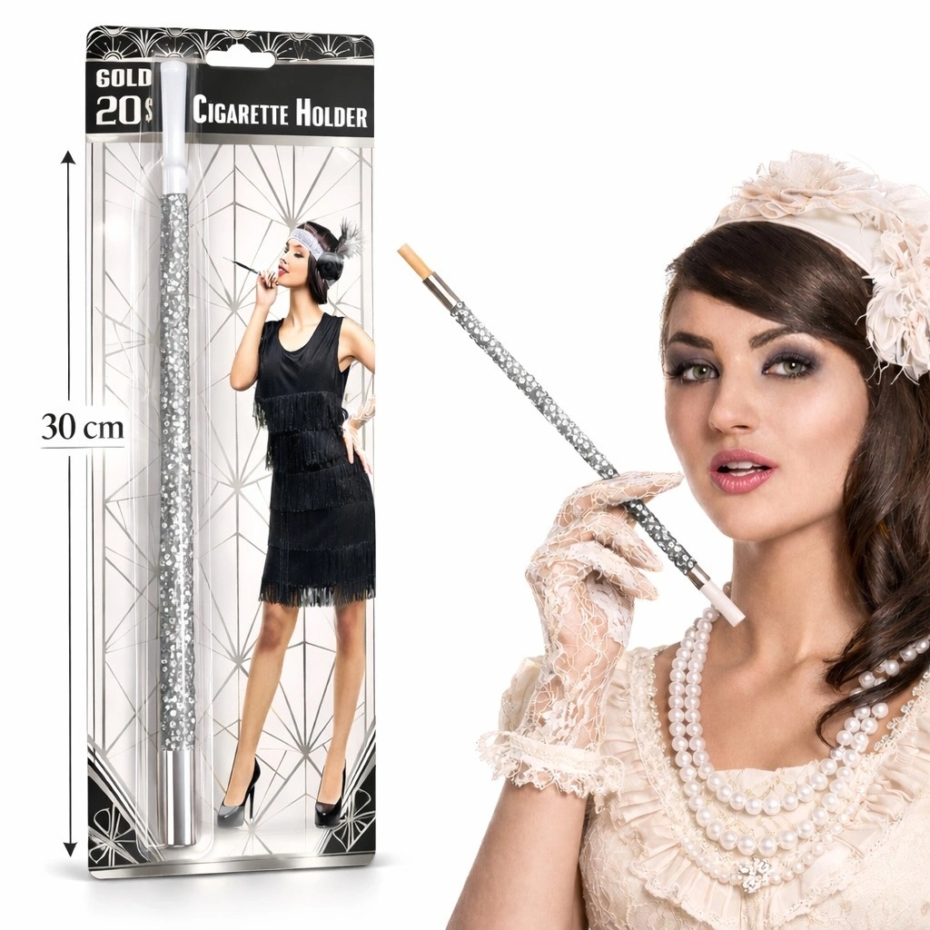 Gümüş Payetli Sigara Tutacağı, 1920’ler temalı parti ve organizasyonlar için tasarlanmış şık ve dikkat çekici bir kostüm aksesuarıdır. 30 cm uzunluğundaki ideal ölçüsü sayesinde elde zarif bir duruş sağlar ve kombinlere nostaljik bir hava katar. Gümüş renkli payet kaplama tasarımı ışık altında parlayarak sahne, fotoğraf çekimi ve konsept etkinliklerde etkileyici bir görünüm oluşturur. Özellikle Gatsby temalı davetler için tercih edilen gümüş sigara tutacağı, kostüm partilerinde stilinizi tamamlayan iddialı bir detay sunar. Uzun ve ince formu ile estetik bir kullanım sağlayan 1920ler parti aksesuarı, vintage konsept kombinlerin vazgeçilmez tamamlayıcısıdır. Gösterişli ve dekoratif yapısıyla öne çıkan payetli sigara tutacağı, eğlenceli organizasyonlar için ideal bir tercihtir. Ürün Teknik Özellikleri Özellik Açıklama Ürün Adı Gümüş Payetli Sigara Tutacağı Uzunluk 30 cm Renk Gümüş Tasarım Payet Kaplama Kullanım Alanı 1920'ler Temalı Partiler ve Kostüm Organizasyonları Paket İçeriği1 Adet Gümüş Payetli Sigara Tutacağı