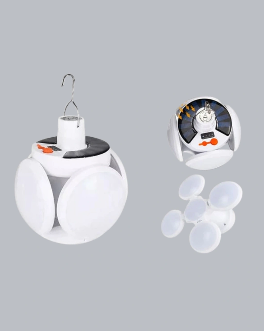 Bu LED kamp lambası, taşınabilirliği ve kullanım kolaylığıyla öne çıkar. Katlanabilir 5 kanatlı yapısı sayesinde ışık açısını dilediğiniz gibi ayarlayabilir, geniş veya odaklı aydınlatma sağlayabilirsiniz. Askı halkasıyla çadırınıza, balkona veya tavan kancasına kolayca asabilirsiniz. Katlandığında kompakt hale gelir ve çok az yer kaplar. Hem güneş enerjisiyle hem de USB kabloyla şarj olabilen çift şarj sistemiyle her yerde kullanılabilir. 2400 mAh lityum pili tam şarjla 6-8 saat kesintisiz ışık sunar. 5 farklı ışık modu sayesinde ister kamp alanında, ister bahçede, ister elektrik kesintilerinde kullanabilirsiniz. IP65 su geçirmez yapısı, açık havada güvenli kullanım sağlar. Güçlü LED teknolojisi sayesinde enerji tasarrufu sağlar, doğayla dost bir çözümdür.